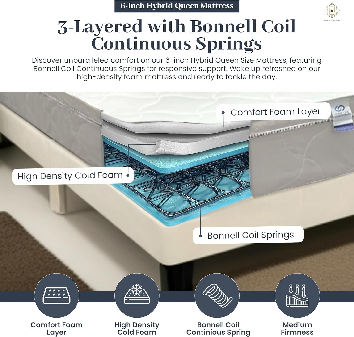 🛌 BONNELL SPRINGS SUPPORT: Experience unparalleled durability and bounce with our queen hybrid mattress featuring Bonnell Coil Springs. Elevate your sleep on this 6-inch queen size mattress, perfect for beds requiring medium-firm support. Embrace the classic comfort of our 1-inch-thick high-density foam mattress, providing excellent motion isolation.