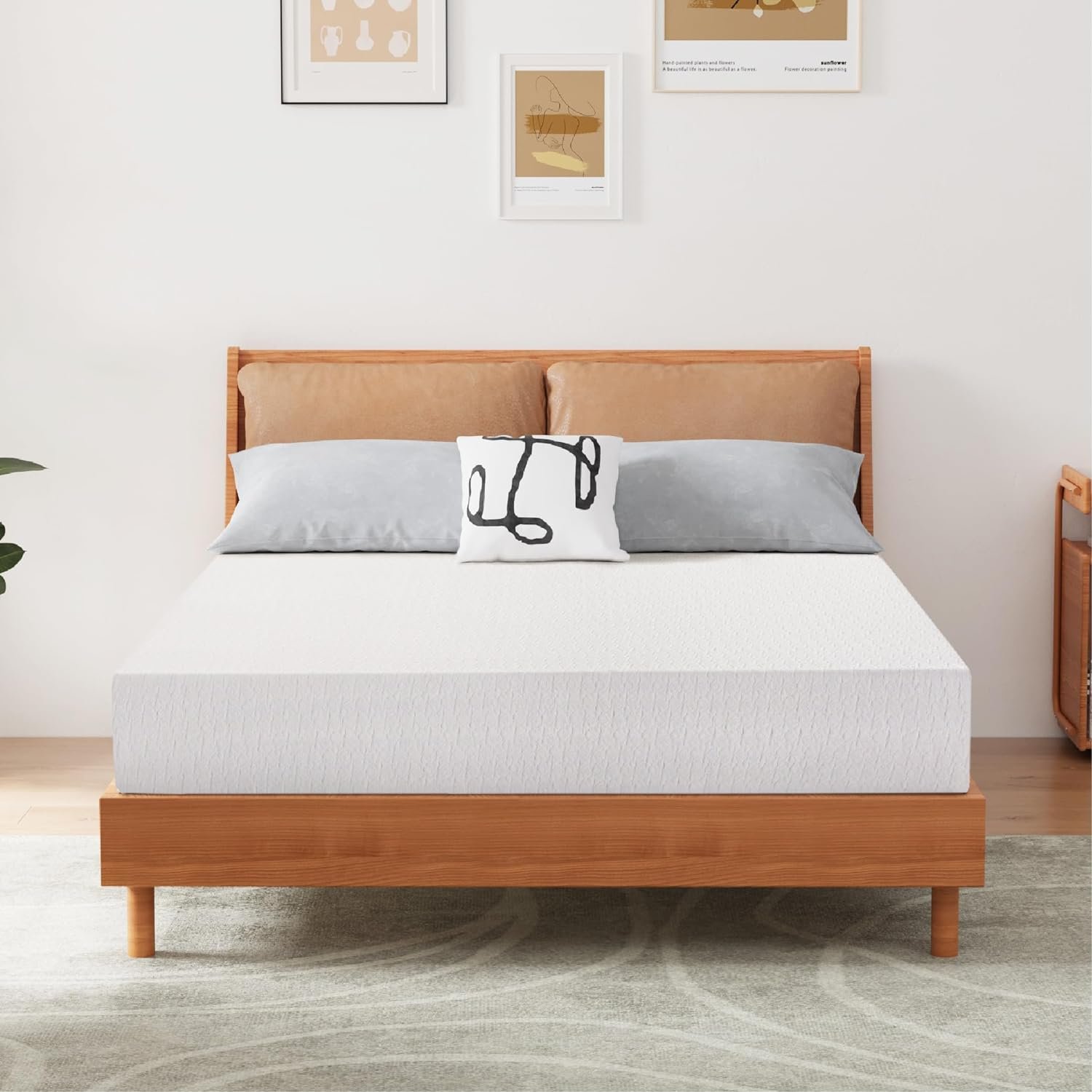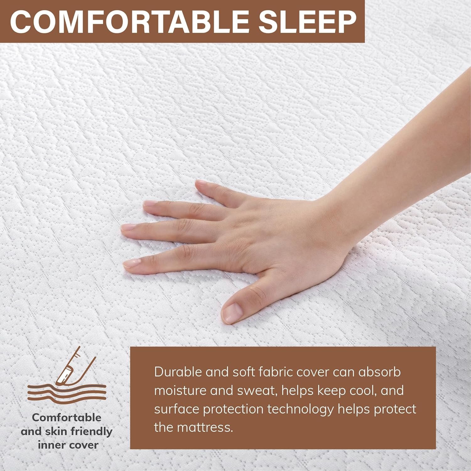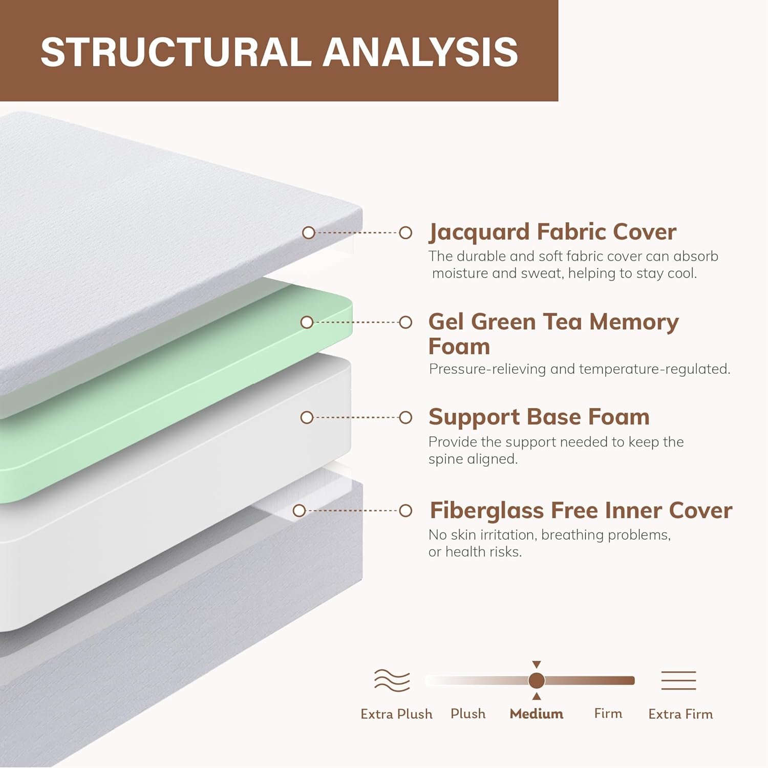 Cooling Gel-Infused Green Tea Memory Foam Mattress: The mattress provides pressure-relieving and temperature-regulated sleep. The all-foam system includes ultra-cooling gel and green tea infused memory foam, along with durable, high-density base support foam. The green tea infusion helps to keep the green tea memory foam mattress fresh and clean, while the cooling gel helps regulate temperature and prevent overheating.