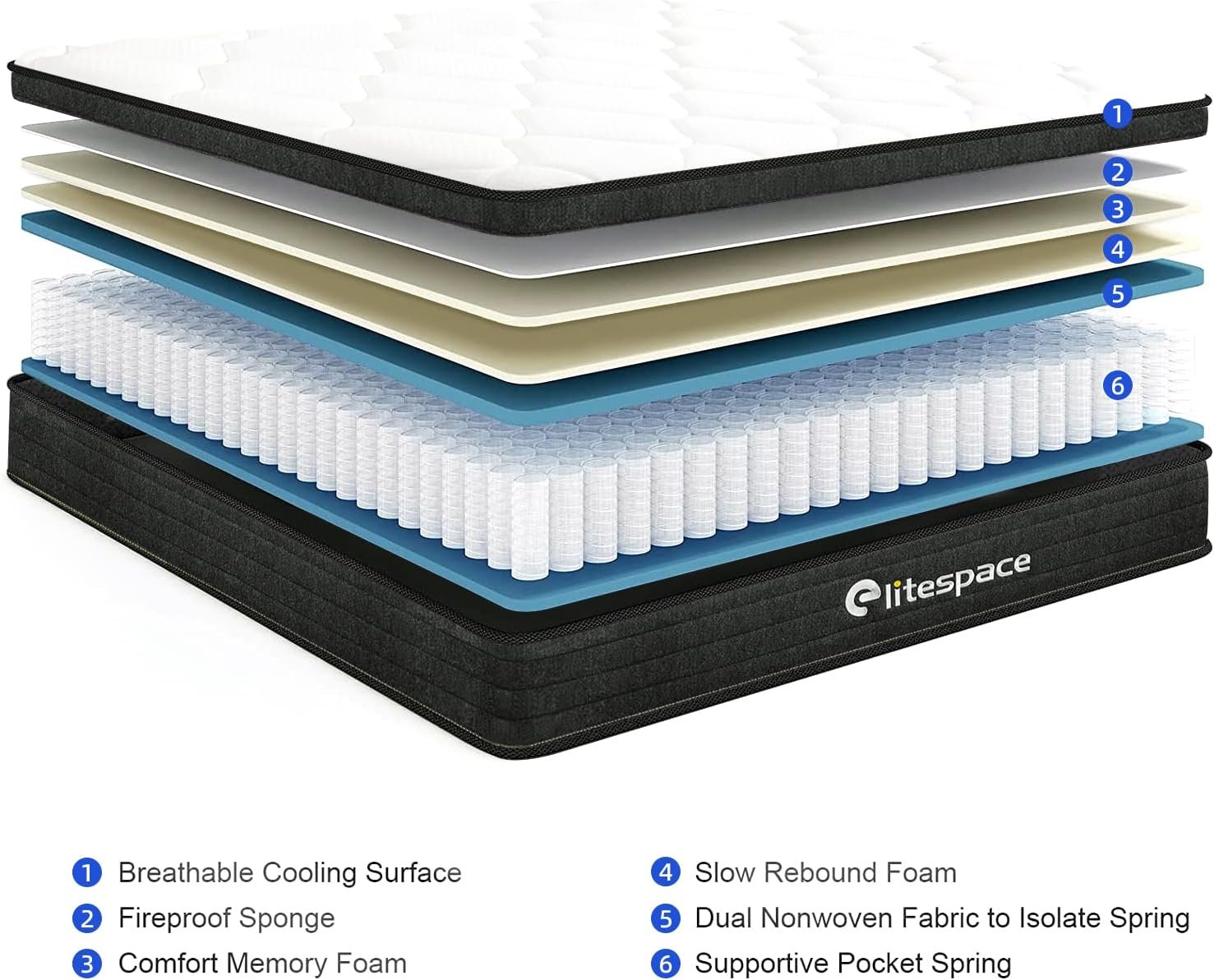High-quality Top Sponge: Elitespace queen size spring mattress is made of high-quality knitted fabric, multi-layer high-quality sponge keeps you away from back pain. All memory foam is CertiPUR-US certified and tested to be free of harmful substances.