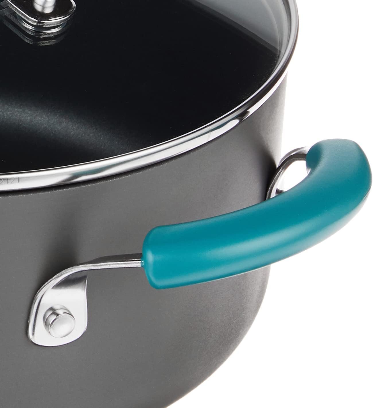 GET A GRIP: Pots and pans set feature rubberized grippy handles that are dual riveted for strength and easy handling while cooking and serving
