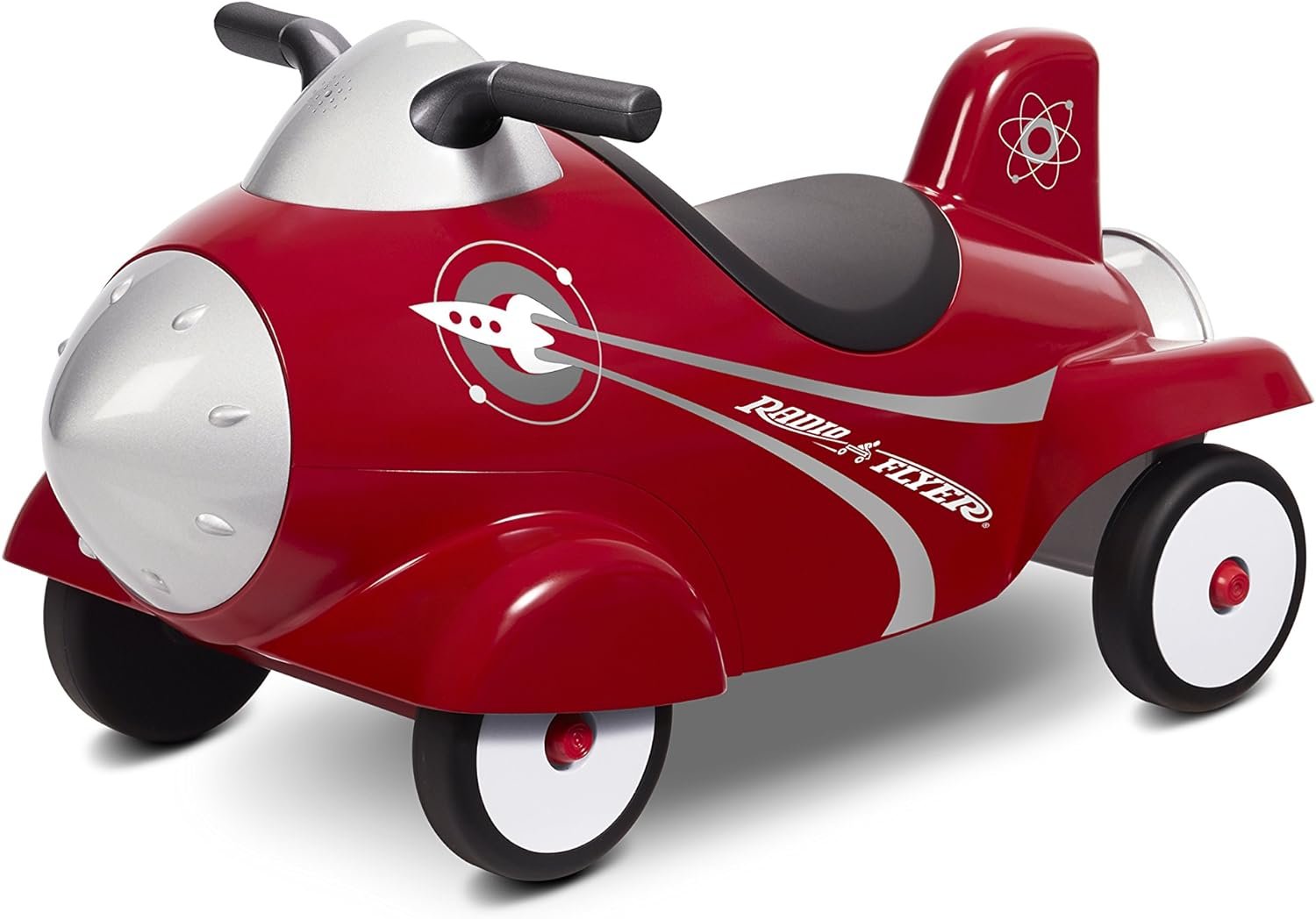 The Radio Flyer Retro Rocket is designed in a classic cool styling and with imagination in mind! The flashing lights and realistic astronaut and space sounds provide hours of fun. The smooth seat provides comfortable riding, and simply lift to find a storage area. The four wheels add stability for a safe and sturdy ride. Turn the clicking nose cone for added fun.