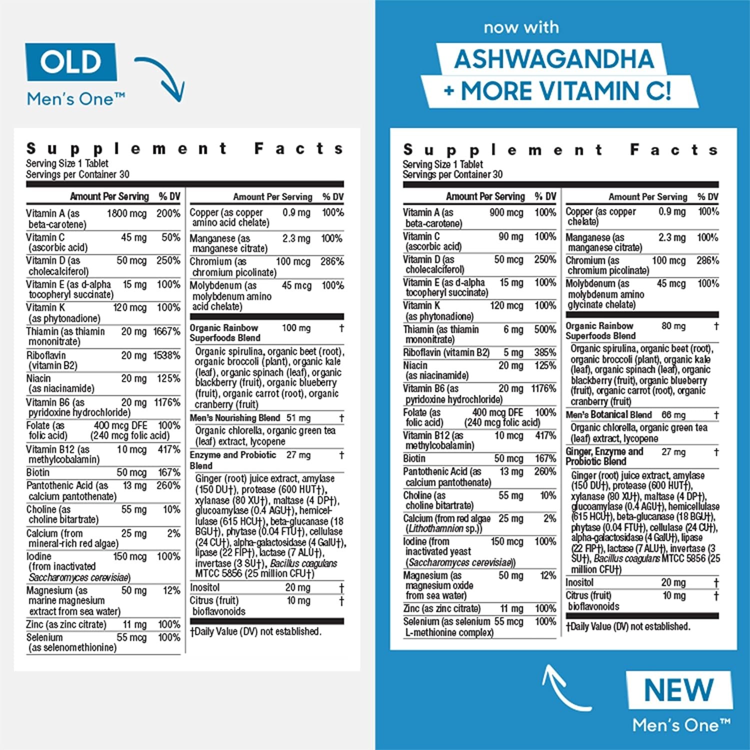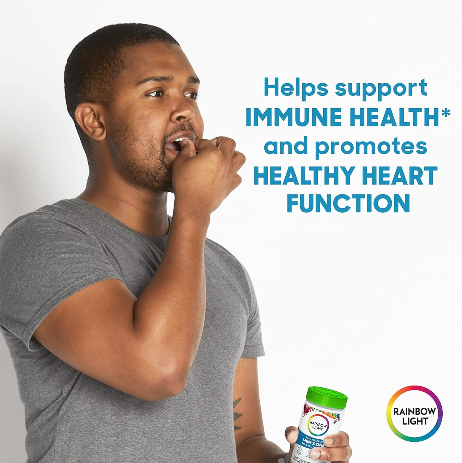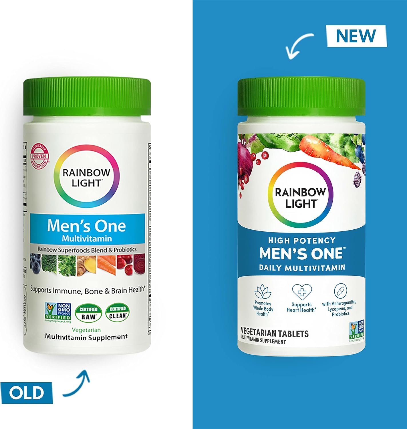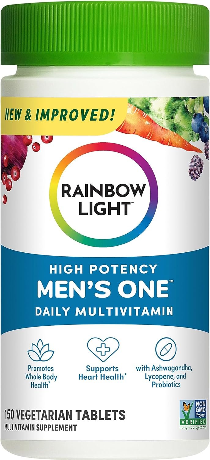 Rainbow Light Mens One High Potency Daily Multivitamin, with ready-to-absorb minerals, is formulated to support optimal nutrition and replenishment, giving you a solid foundation to power you forward.* It promotes whole body health and supports heart health, and it is formulated with 100% or more of the daily value of 20 vitamins and minerals.* Rainbow Light Mens One includes ashwagandha, lycopene, and probiotics; and has more vitamin C than our previous Mens One Multivitamin. This daily multivitamin for men supports normal energy-yielding metabolism, supports immune cell functioning (with vitamin C, vitamin D, and zinc), and supports brain health.* Vegetarian multivitamin, Non-GMO Project Verified, Certified C.L.E.A.N., Certified R.A.W. *These statements have not been evaluated by the Food and Drug Administration. This product is not intended to diagnose, treat, cure, or prevent any disease; **When compared to our previous Mens One Multivitamin
