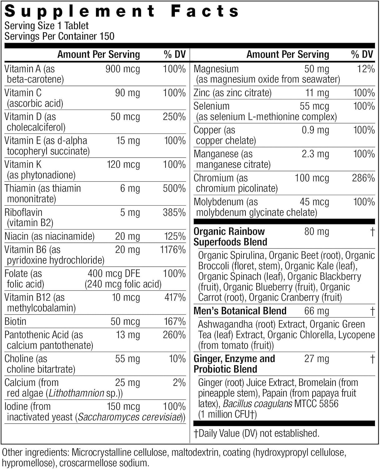 MEN’S MULTIVITAMIN: Non-GMO Project Verified, Certified C.L.E.A.N., Certified R.A.W., vegetarian; contains no wheat, milk, tree nuts, peanuts, soy, eggs, fish or shellfish