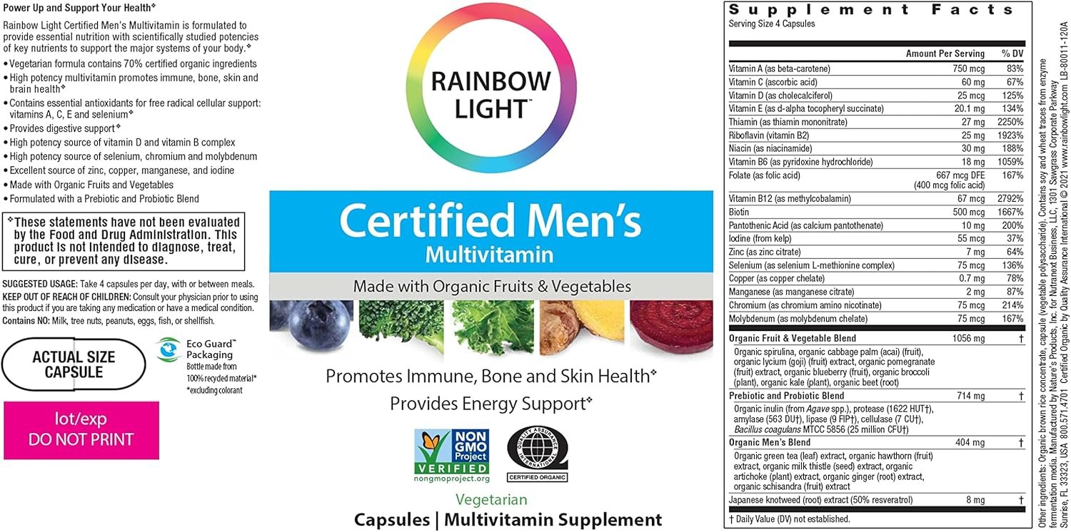 Certified Men’s Multivitamin delivers nutrition with clinically researched potencies of key nutrients that protect the major systems of a man’s body. A potent B-vitamin complex and Resveratrol support the heart and brain, and help fight the signs of aging. 1,000 IU of vitamin D3 promotes healthy and strong bones. To give men the robust energy and stamina they need to live life with vigor and vitality, Certified Men’s Multivitamin includes a combination of B vitamins, whole foods and a special Organic Strength & Energy Blend of green tea, hawthorn, and schisandra. The Organic Liver Support Blend works to help cleanse the body of toxins and supports the health of the liver. Certified Men’s Multivitamin is bursting with wholesome, nutrient-dense foods. The Organic Antioxidant Fruit & Vegetable Blend includes spirulina, acai berry, goji berry, pomegranate, blueberry, broccoli, kale, and beet. Together, these antioxidant powerhouses work to scavenge free radicals and help boost health and vitality. The formula’s Gentle Digestive Support blend of enzymes and probiotics, supports digestive health, promotes, regular elimination, and assists in nutrient absorption.