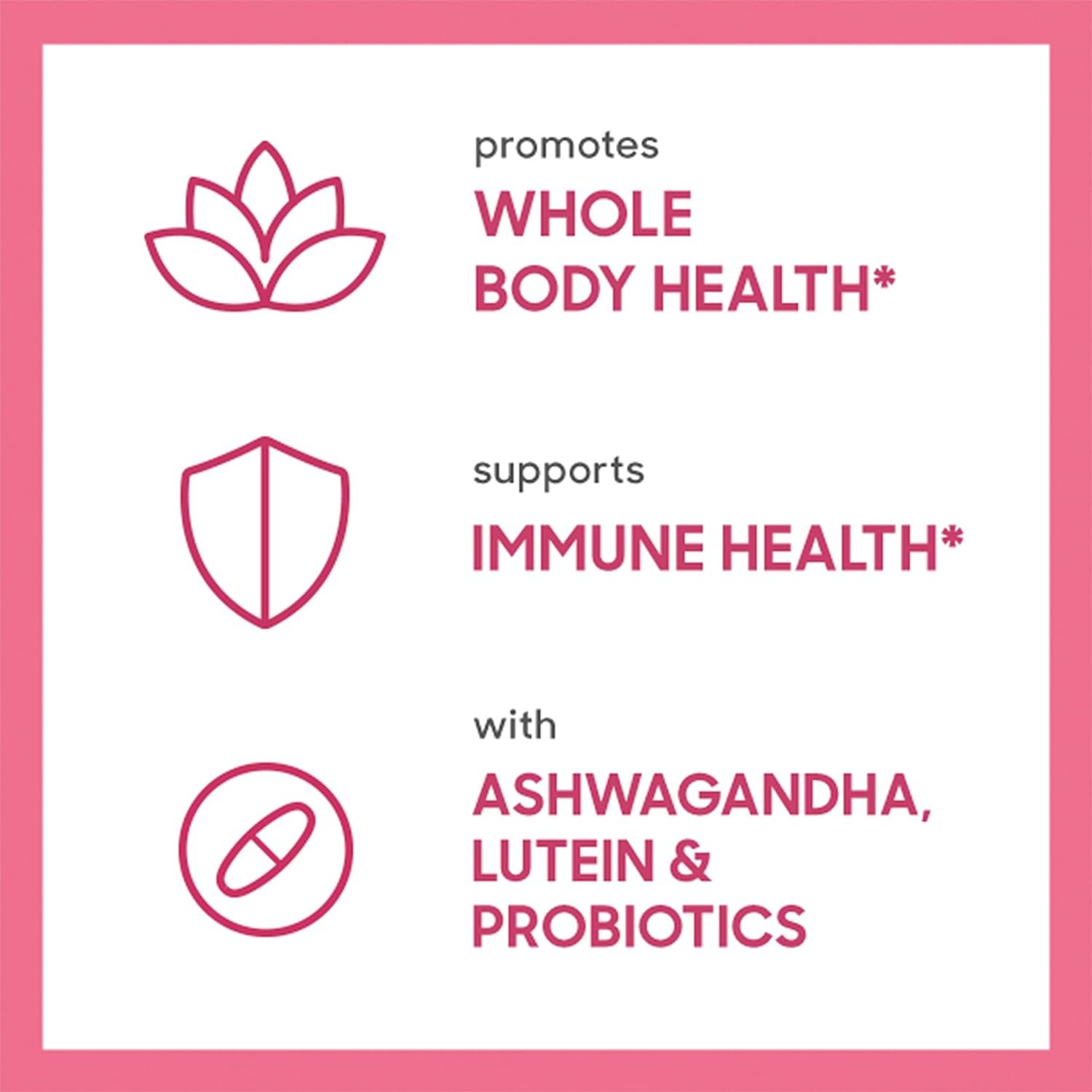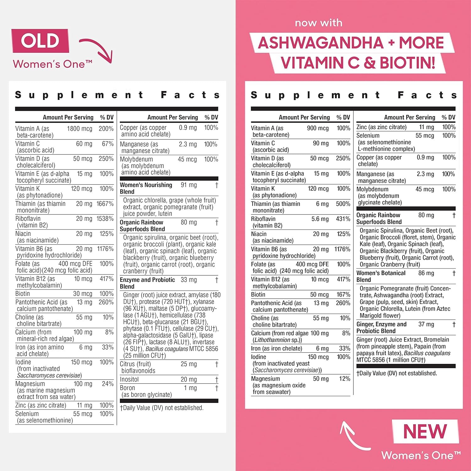 HEALTH-ORIENTED: Has ashwagandha, lutein, probiotics and more vitamin C and Biotin than previous Women’s One Multivitamin; it also has 100% or more of the daily value of 19 vitamins and minerals
