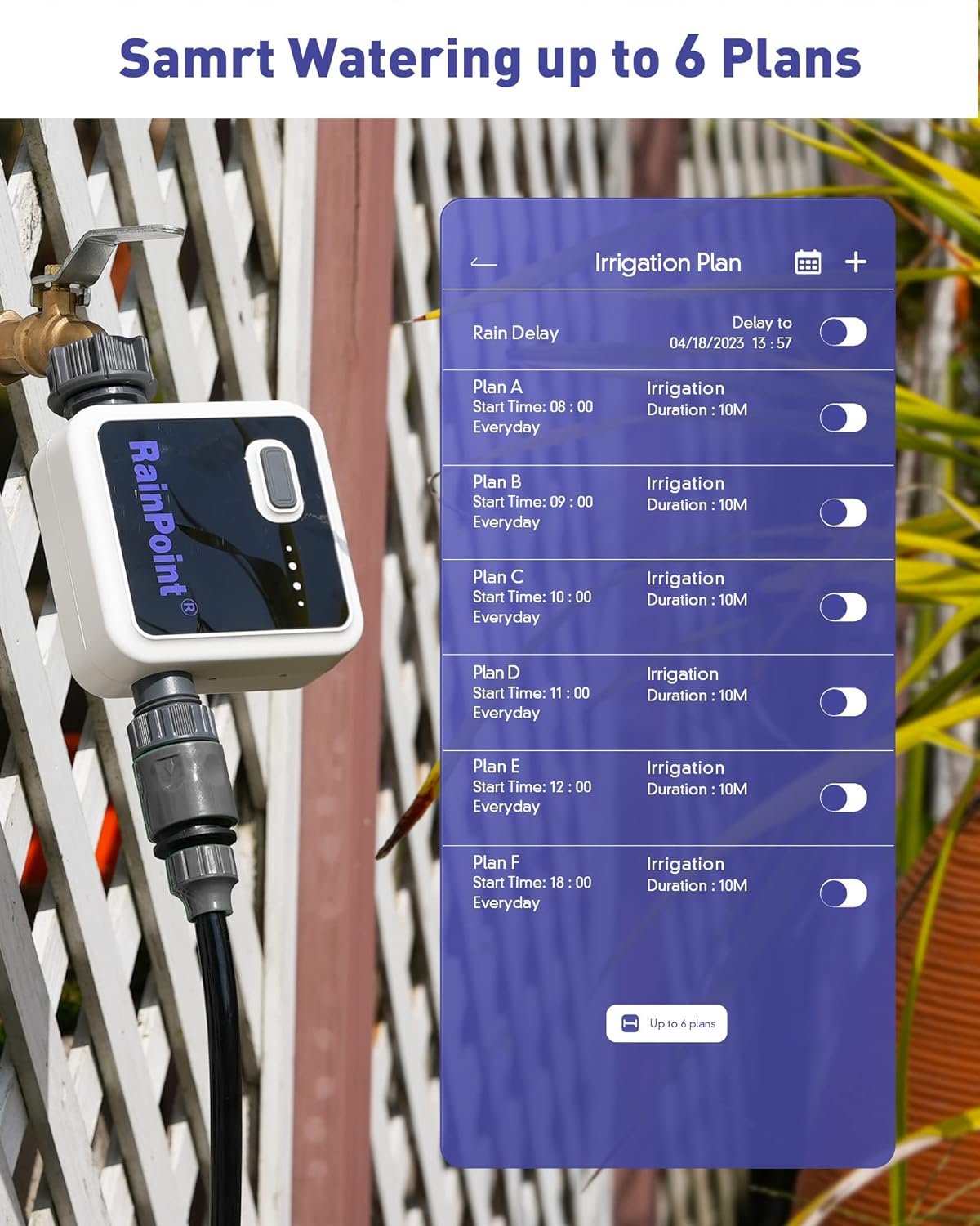 One Setup to Delay Watering: Do you need to temporarily change or interrupt your regular watering program? RAINPOINT sprinkler timer allows you to water or stop watering at will without affecting your preset schedule. Using the Rain Delay mode, you can put your hose timer schedule on hold for 24 to 72 hours to conserve water and avoid overwatering on rainy days.