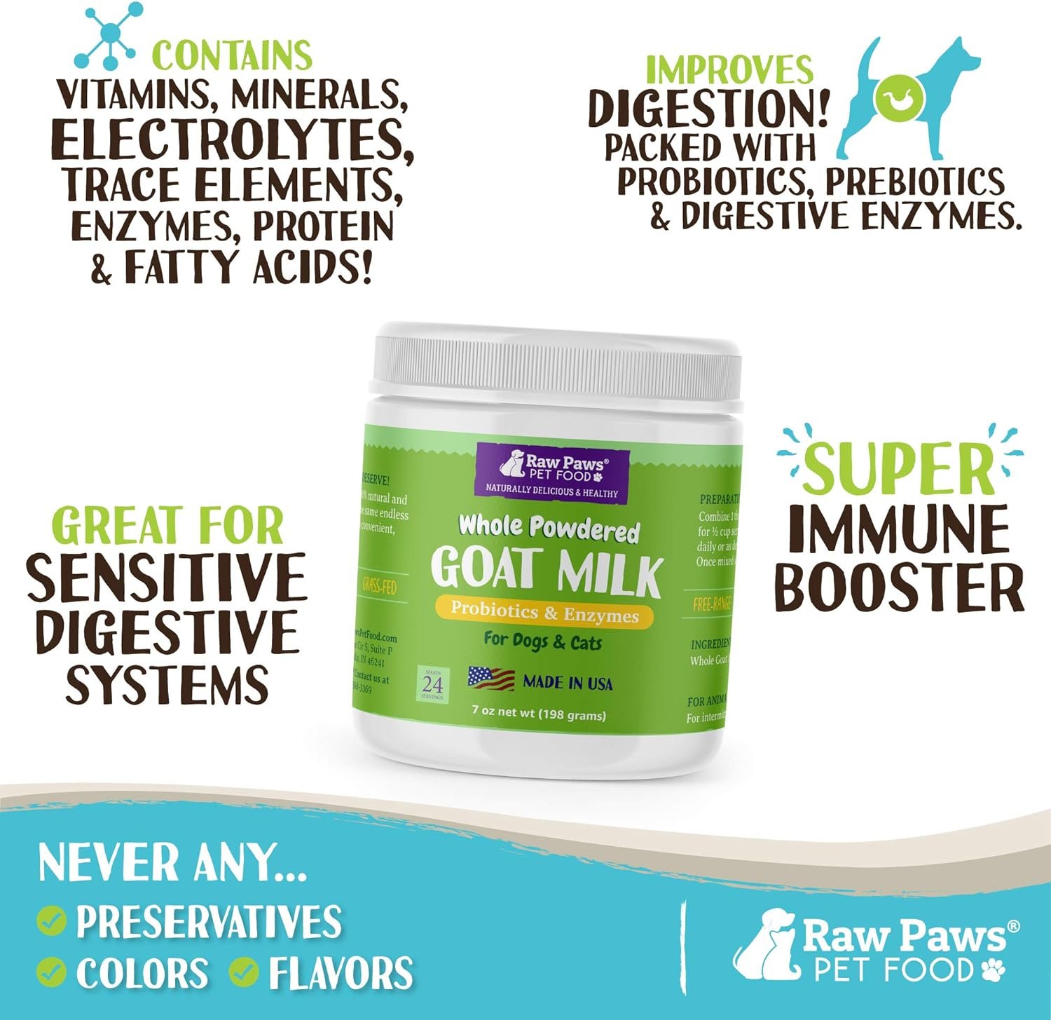 POWDERED GOAT MILK FOR DOGS AND CATS: Naturally helps to provide relief from pet allergies and alleviate pet joint pain. Probiotics, naturally found in whole goat milk powder, help to fight off the growth of yeast that leads to itchy paws, ears and hot spots. Also high in digestive enzymes, dry cat and dog goat milk helps to relieve inflammation and joint pain giving your pet a boost in their activity level.