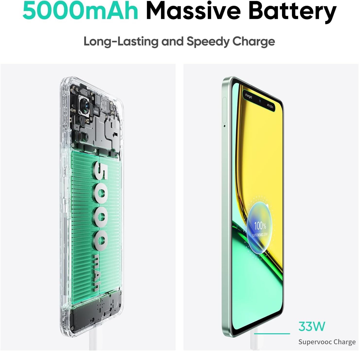 Large 5000mAh Battery with 33W Fast Charging: Enjoy more time unplugged thanks to the extra-large battery, and experience rapid charging with the advanced SuperVOOC charging technology.