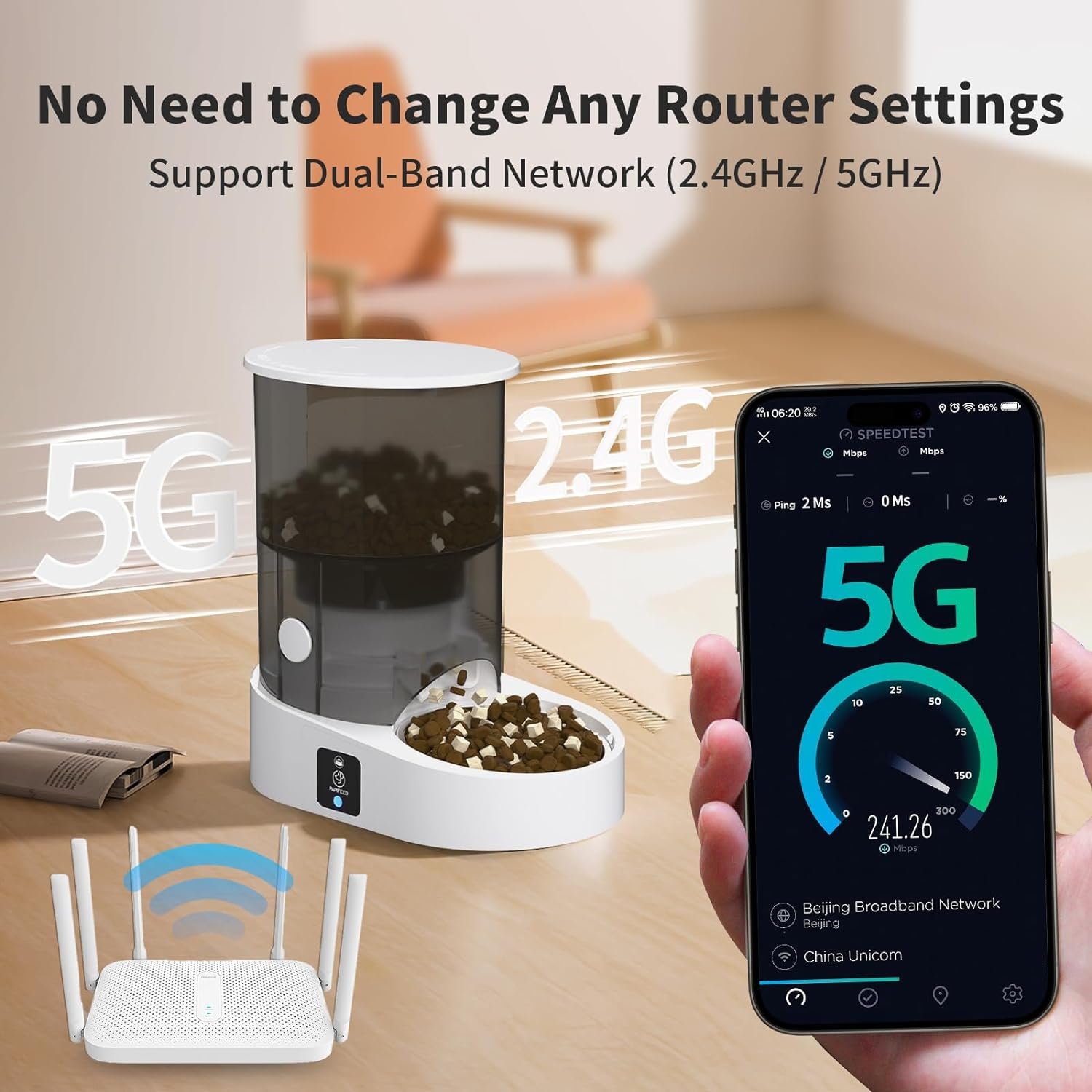 2.4G/5G DUAL WIFI CONNECTION – The wifi cat feeder supports 2.4GHz and 5GHz network bands. No need to change the configuration of your home router to easily connect to the timed cat feeder.