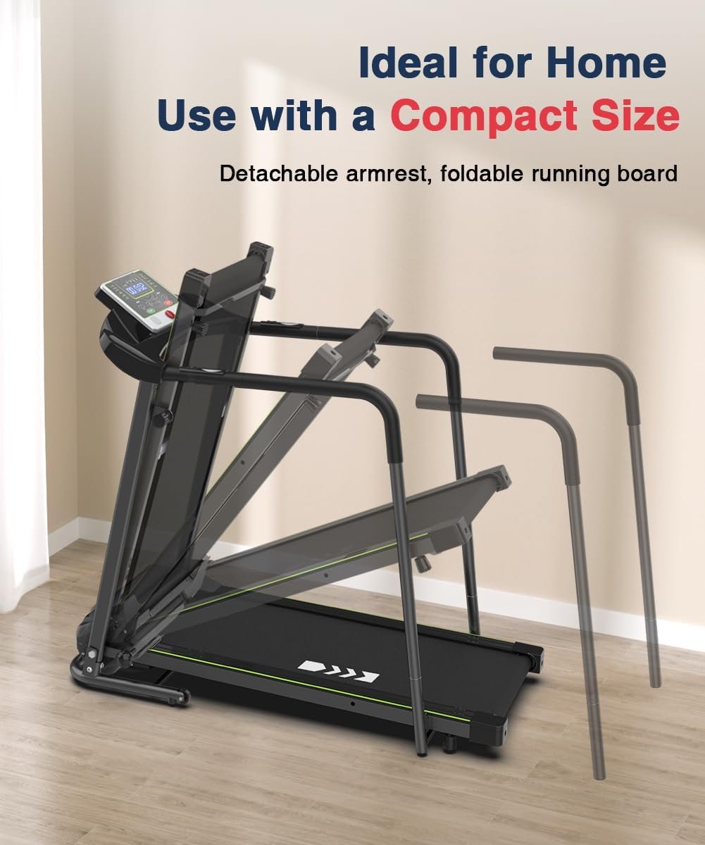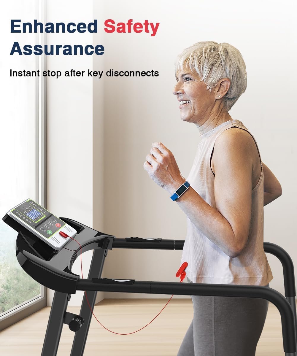 【Extended Handrail & Safety Guarantee】For the elderly to use walking treadmill, the most important issue is safety. For this purpose, we have designed the following. Use the multi-grip handrails that sit along the top, middle, and end of the low-deck treadmill for extra support, to avoid falling due to an unstable center of gravity. In the event of an accidental fall, the safety key will immediately drop to disconnect the power supply.