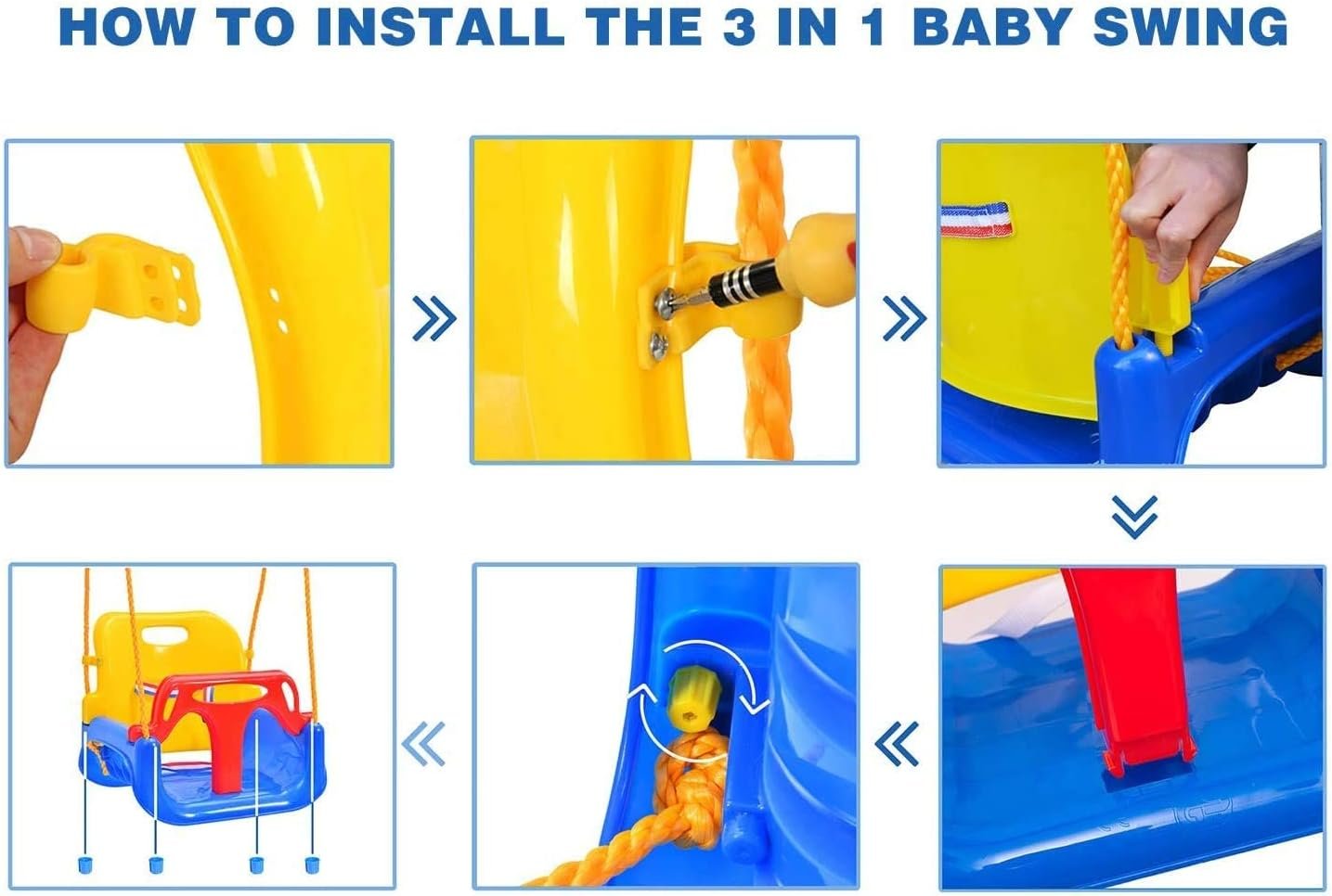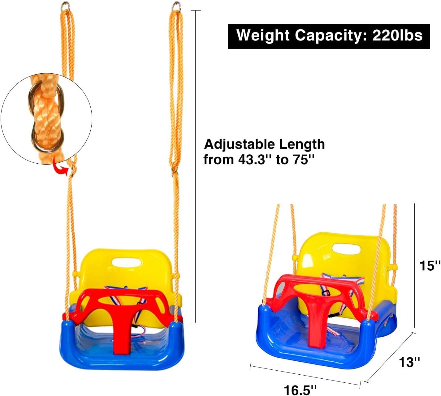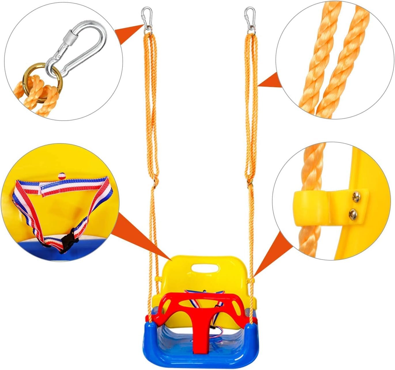 Durable: The Swing Seat is made of high quality Polypropylene, Nylon ensure years of swinging. Weight Capacity is 220lbs/100kg. Reinforced Screws Design to Keep the Child Secure.