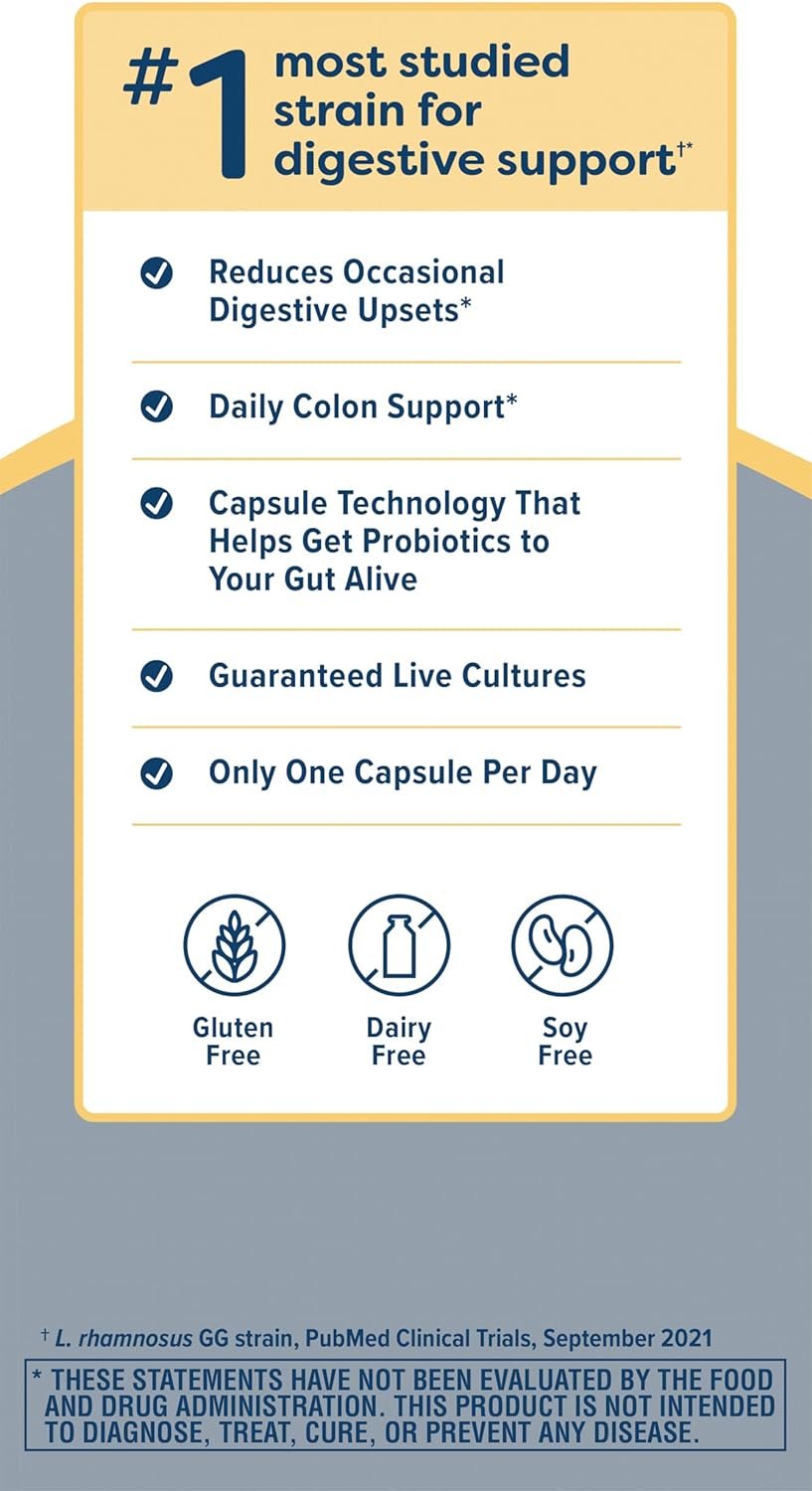 Renew Life Probiotic Adult 50 Plus Capsules offer 12 probiotic strains in easy-to-swallow capsules to support digestive health and provide immune support (1). Featuring more clinically studied strains than the leading brand (2), these men’s and women’s probiotic pills contain a blend of 12 different probiotic strains including L. rhamnosus GG, the No. 1 most studied strain (3). With 30 billion cultures, these Renew Life probiotic capsules make it easy for you to support your digestive and immune health. Each strain is clinically tested and formulated by microbiologists and researchers to offer science-backed health benefits you can enjoy every day. Potency, quality and purity are guaranteed through the expiration date. This daily probiotic supplement offers a Non-GMO Project Verified formula that is gluten-free, dairy-free and soy-free. Renew Life puts health and wellness first with supplements that are backed by over 25 years of clinical trials. (1) These statements have not been evaluated by the Food and Drug Administration. This product is not intended to diagnose, treat, cure or prevent any disease. (2) Based on IRI unit sales data, January 2021. (3) L. rhamnosus GG strain, PubMed Clinical Trials, August 2019.