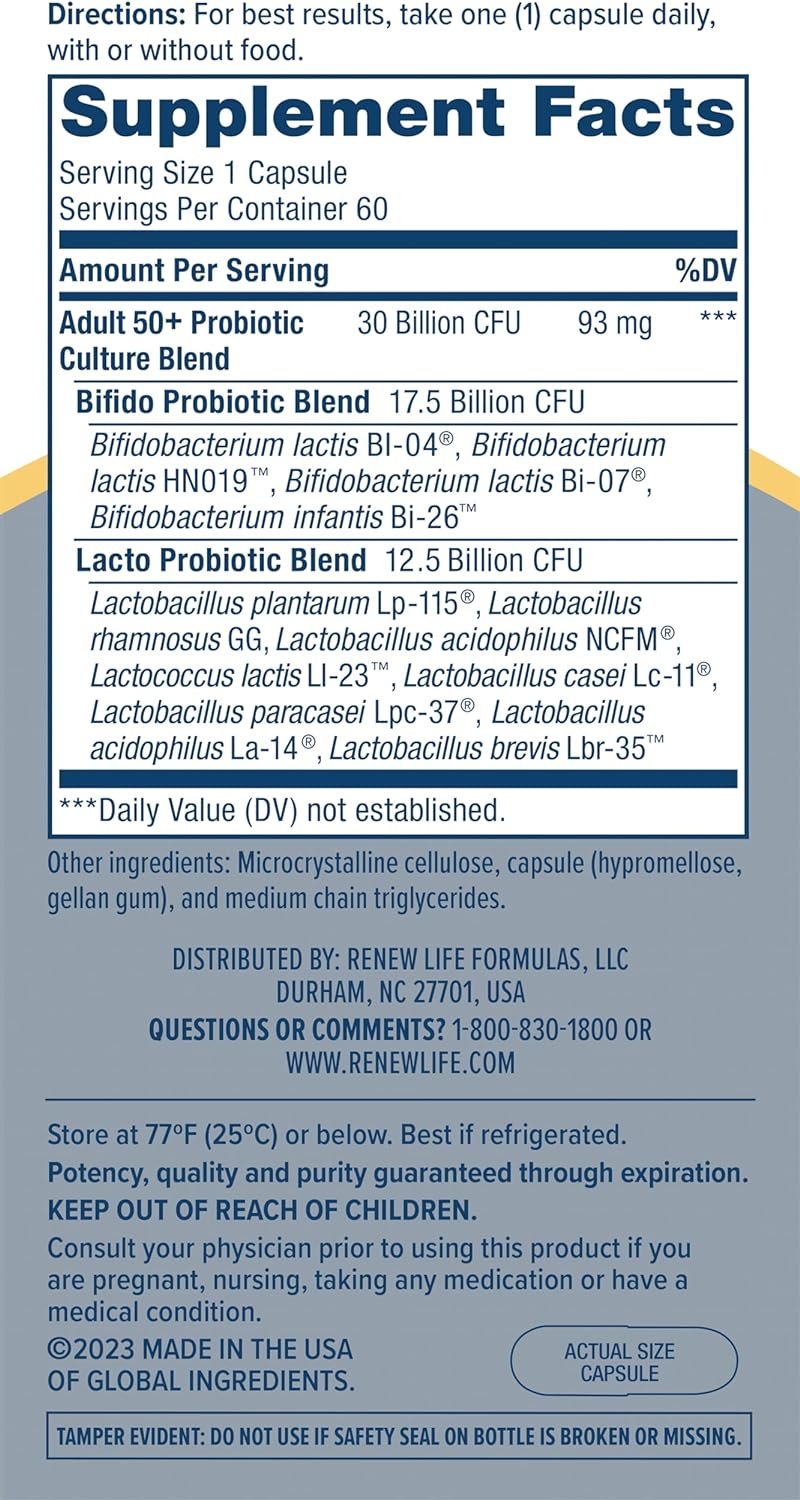 Renew Life Probiotic Adult 50 Plus Probiotic Capsules, Daily Supplement Supports Urinary, Digestive and Immune Health, L. Rhamnosus GG, Dairy, Soy and gluten-free, 30 Billion CFU, 60 Count