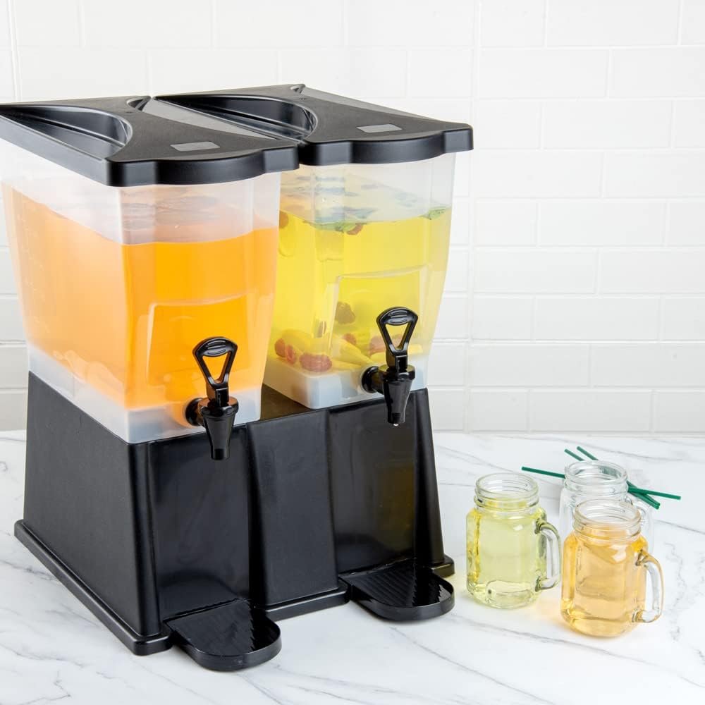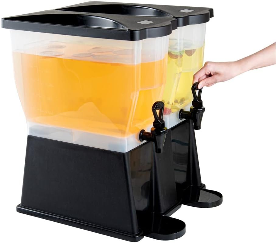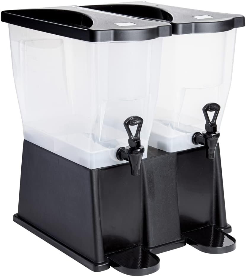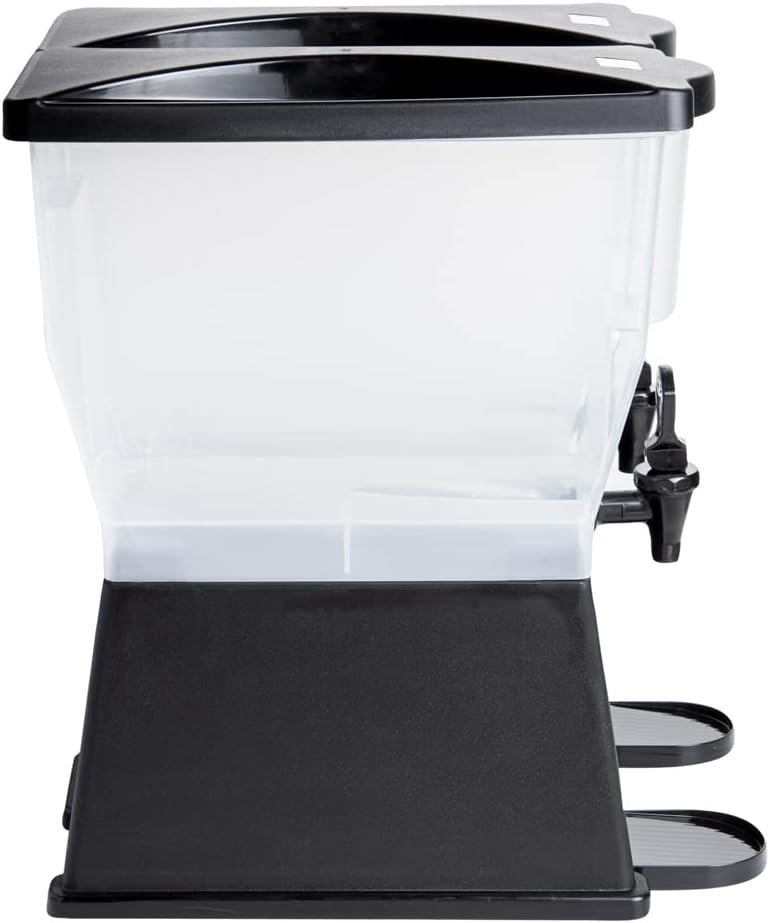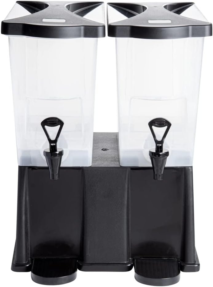 Use our Bev Tek 6-gallon Black Double Beverage Dispenser to serve your signature chilled beverages in style. Made with PP (Polypropylene) plastic, this juice dispenser is durable and withstands temperatures from -40F to 160F, letting you serve all beverages. The double design of this 6-gallon beverage dispenser enables you to serve two drinks simultaneously. Featuring 2 translucent tanks of 3 gallons each, this iced tea dispenser offers excellent visibility. They are detachable from the base for convenient refilling and cleaning. The high-quality material of this cold drink dispenser makes it freezable and dishwashable. Equipped with 2 push button spigots/faucets, this plastic juice dispenser ensures faster juice flow with fewer drips. The removable drip tray at the base of this lemonade dispenser catches drips, keeping your countertop clean. To let you use glasses of any length, this beverage dispenser with a stand has an 8-inch clearance below the nozzle. This rectangular party drink dispenser comes with two tight-fitting lids to protect your beverages during service and transport. To measure your drinks precisely, this beverage dispenser with a spigot has printed graduations. This soft drink dispenser has decals for punch, iced tea, decaffeinated iced tea, lemonade, water, and coffee for instant identification. Measuring 16 inches long by 16 inches wide by 21 inches tall, this cocktail dispenser has a generous capacity of 6 gallons to minimize the time spent refilling during large events. Shipped in a 1 count box.