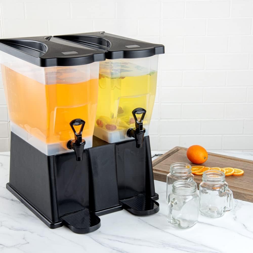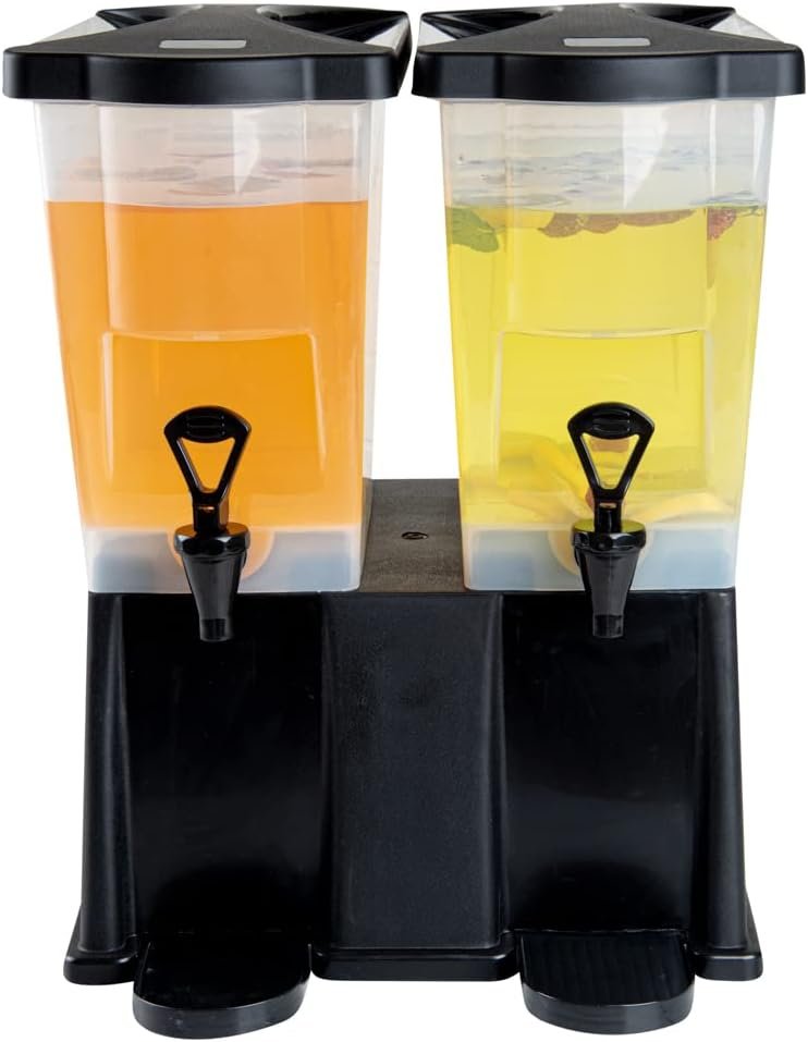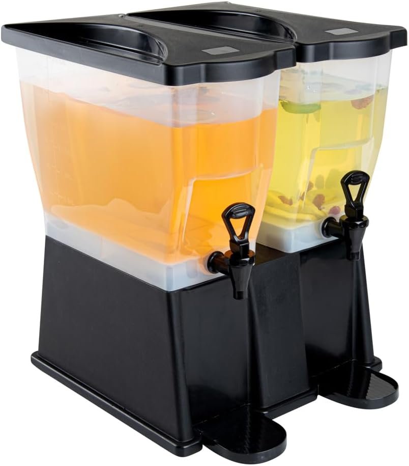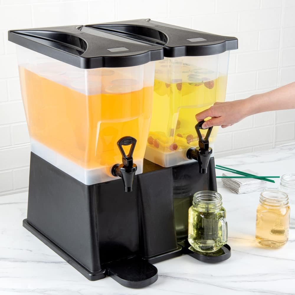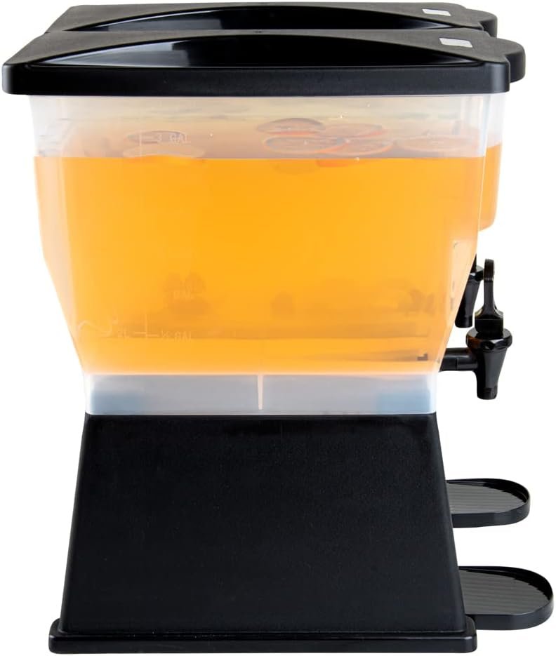 Use our Bev Tek 6-gallon Black Double Beverage Dispenser to serve your signature chilled beverages in style. Made with PP (Polypropylene) plastic, this juice dispenser is durable and withstands temperatures from -40F to 160F, letting you serve all beverages. The double design of this 6-gallon beverage dispenser enables you to serve two drinks simultaneously. Featuring 2 translucent tanks of 3 gallons each, this iced tea dispenser offers excellent visibility. They are detachable from the base for convenient refilling and cleaning. The high-quality material of this cold drink dispenser makes it freezable and dishwashable. Equipped with 2 push button spigots/faucets, this plastic juice dispenser ensures faster juice flow with fewer drips. The removable drip tray at the base of this lemonade dispenser catches drips, keeping your countertop clean. To let you use glasses of any length, this beverage dispenser with a stand has an 8-inch clearance below the nozzle. This rectangular party drink dispenser comes with two tight-fitting lids to protect your beverages during service and transport. To measure your drinks precisely, this beverage dispenser with a spigot has printed graduations. This soft drink dispenser has decals for punch, iced tea, decaffeinated iced tea, lemonade, water, and coffee for instant identification. Measuring 16 inches long by 16 inches wide by 21 inches tall, this cocktail dispenser has a generous capacity of 6 gallons to minimize the time spent refilling during large events. Shipped in a 1 count box.