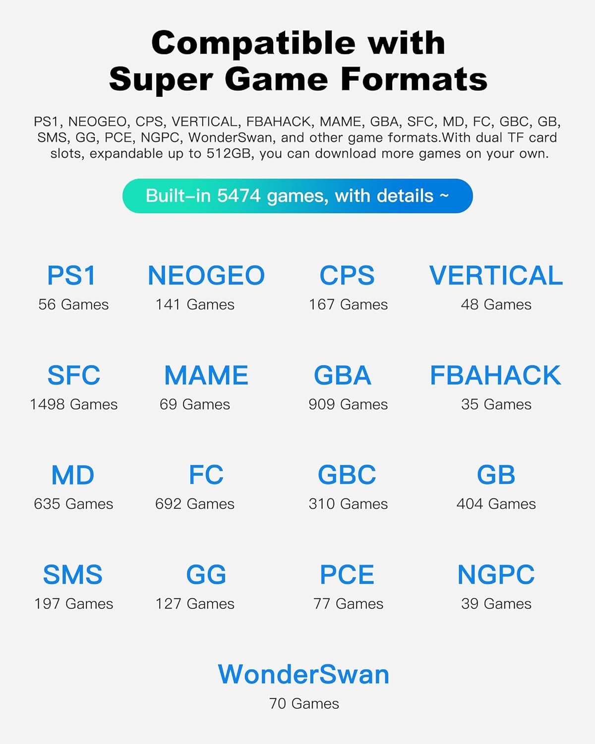 The ANBERNIC RG35XX Retro Game Console comes with a 64G TF Card preloaded with 5570 classic games and supports users to download games in 15 different formats, offering a wide range of gaming options.