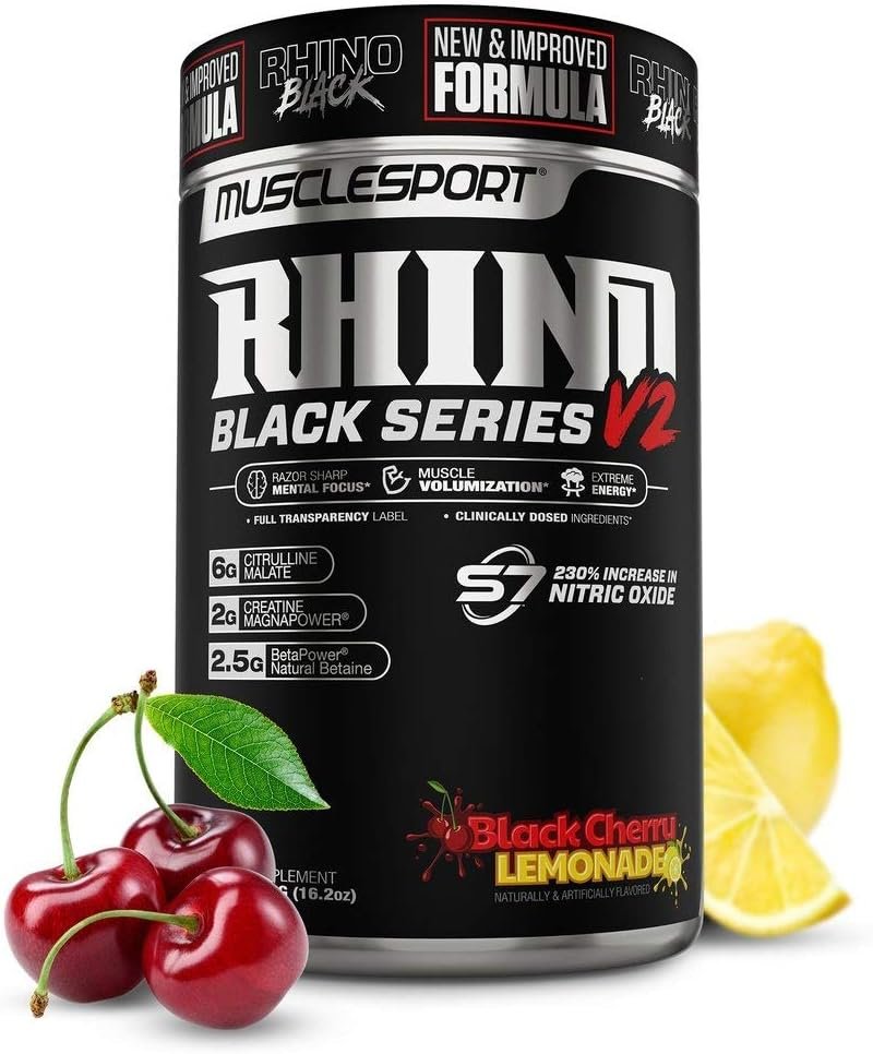 What’s the primary ingredient for everything you’ve ever wanted? Change. Perfection is an evolution, and just like the original Rhino BLACK, Rhino BLACK V2 is here to turn your workout intensity up past 100. With V2, the purpose of Rhino BLACK’s 3 complexes were maintained; they’re still the key to training session success – Pump, Cellular Energy, & Focus. Advancements in ingredient science have brought us to new heights. S7 is a cutting-edge ingredient capable of increasing nitric oxide levels 230%! GlycerSize pours fluid and nutrients into muscle cells for downright crazy pumps. BetaPOWER enhances exercise tolerance, driving more and more gains. Added Theobromine provides greater cognitive clarity for a stronger mind-muscle connection. Keep what works, and add what works better. Rhino BLACK V2 goes for the win, just like you.