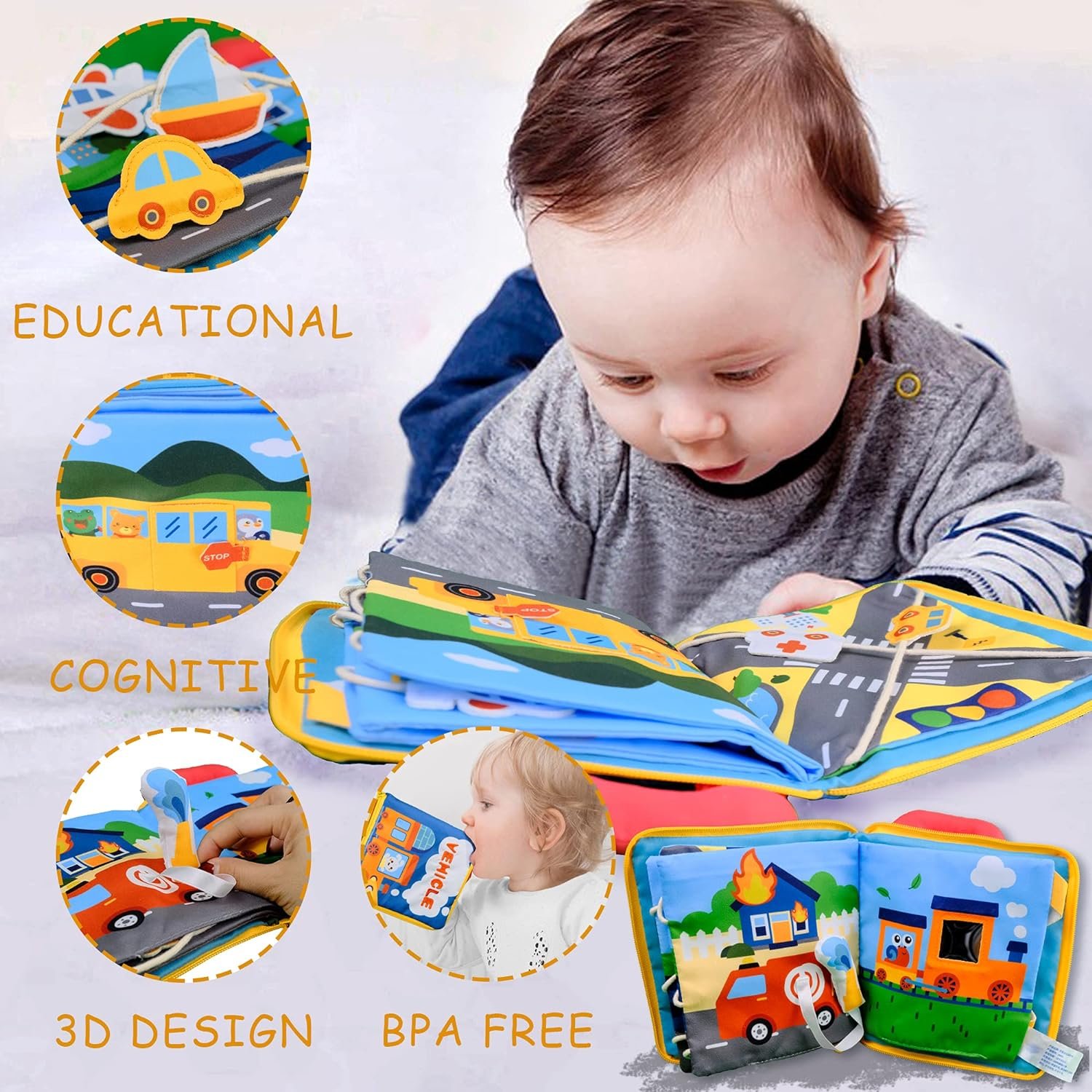 Baby sensory toys 0 3 6 12 months: Each page is something new! Dino: Various dinosaurs and 3D tails, squeaky bubble, crinkle pages, a mirror, colorful and eye-catching images. Vehicles-:Various means of transportation,squeaky bubble,a mini mirror, colorful and eye-catching images. Easy-to-turn pages to help develop motor skills