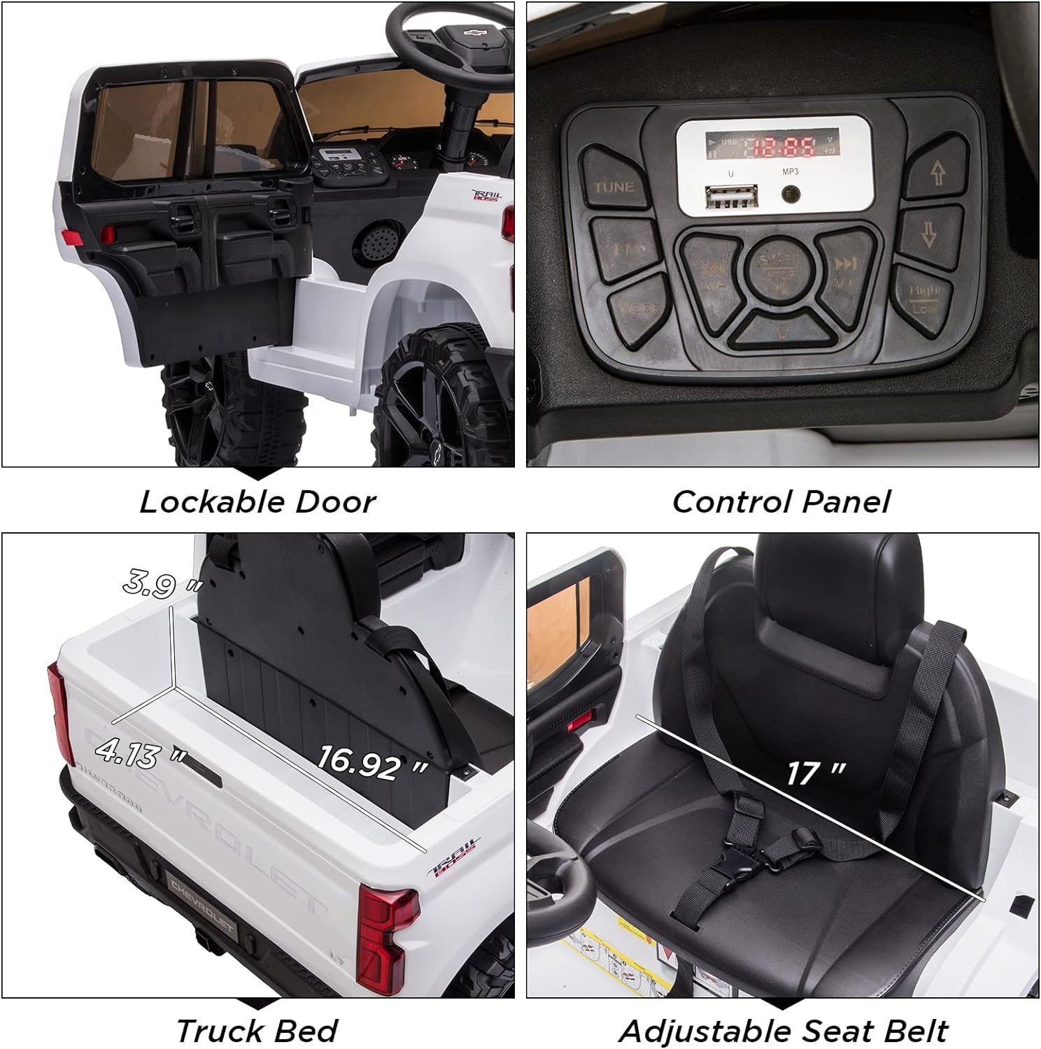 🚗Realistic Chevrolet Silverado Design–Our realistic-looking replica design Chevry car can brings the ultimate happiness for rides! Officially licensed Chevrolet Silverado Trail Boss equiped with bright LED lights,control pedal,realistic engine sound and horn, rechargable battery,spring suspension wheels, offers an authentic experience.