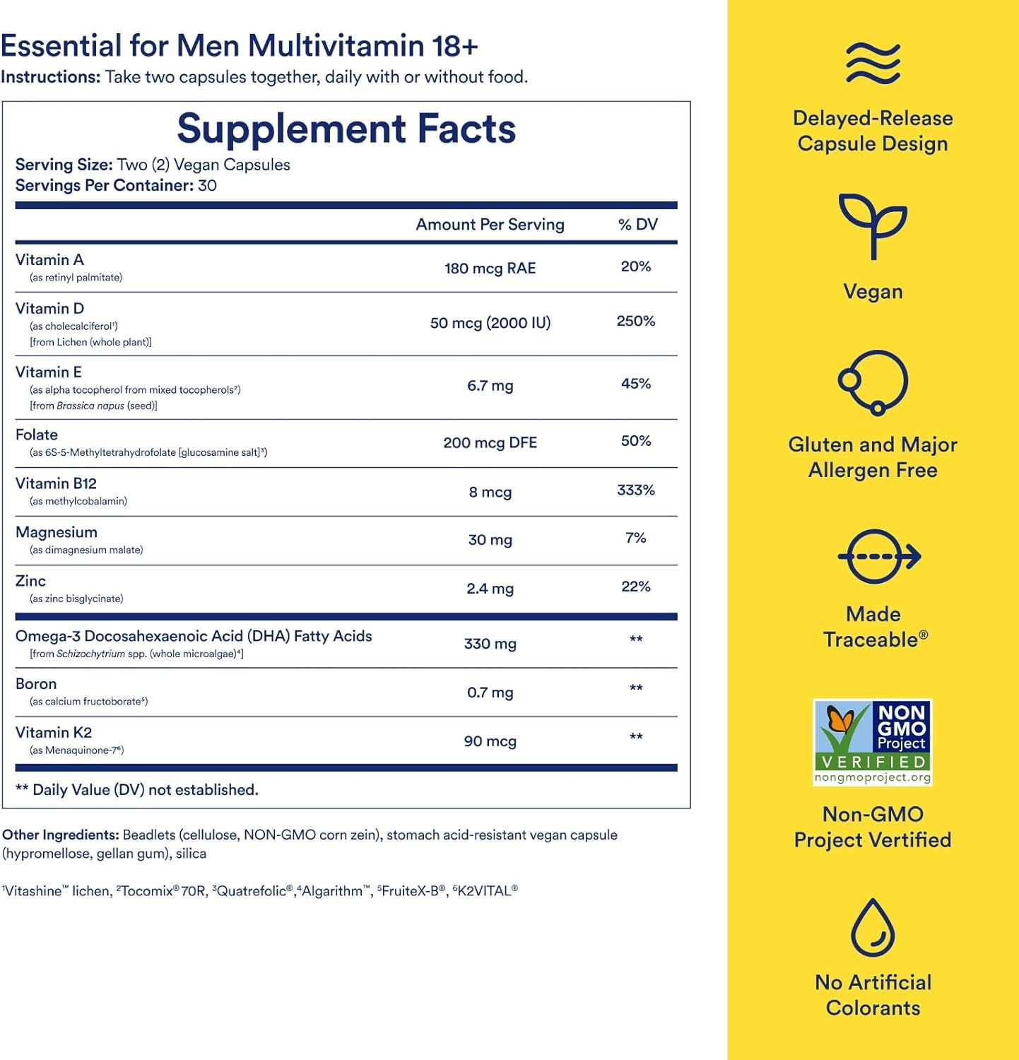 Essential for Men Multivitamin 18+ is the scientifically-developed multivitamin with 10 key nutrients for men 18-49. Our formula is vegan, sugar-free, gluten-free, dairy-free, nut-free, soy-free, and formulated without stevia, sugar alcohols, and artificial colors, flavors, or sweeteners. Each serving provides 330mg of Omega-3 DHA.*