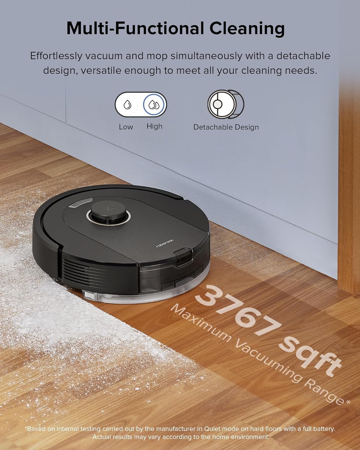 [Multi-Functional Cleaning]: The Q5 Pro+ allows you to seamlessly vacuum and mop your floors at the same time. Thanks to its detachable design, which incorporates an 770ml dustbin and a 180ml water tank, you can tackle multiple cleaning tasks without interruption, making it adaptable to any cleaning task.