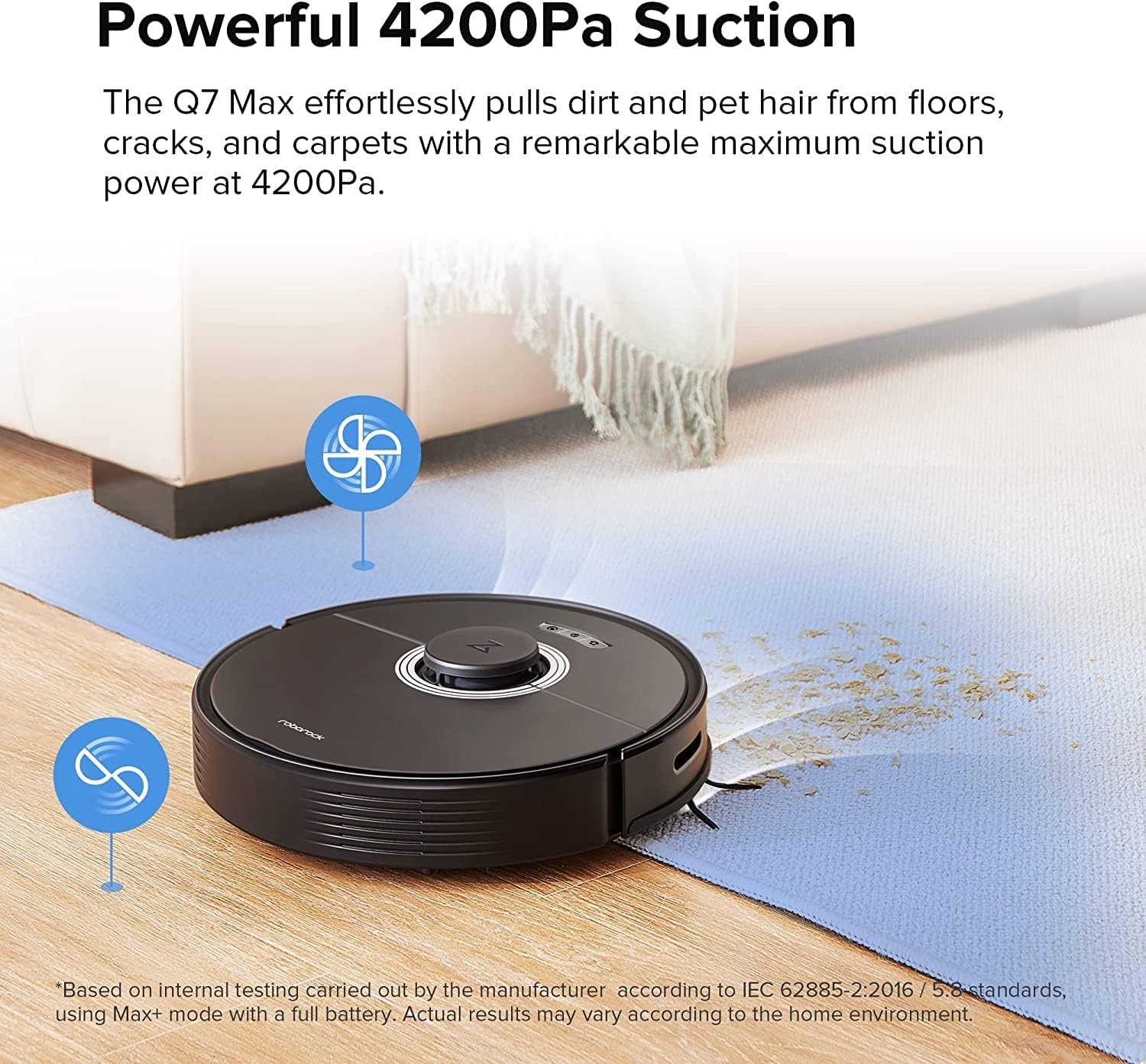 Deeper Cleaning with Powerful 4200 Pa Suction: With an incredible maximum suction power of 4200 Pa, the Q7 Max easily lifts debris and pet hair from floors, drags it from cracks, and draws it from carpets. When a carpet is detected, it will automatically increase its suction to the maximum for deep cleaning.