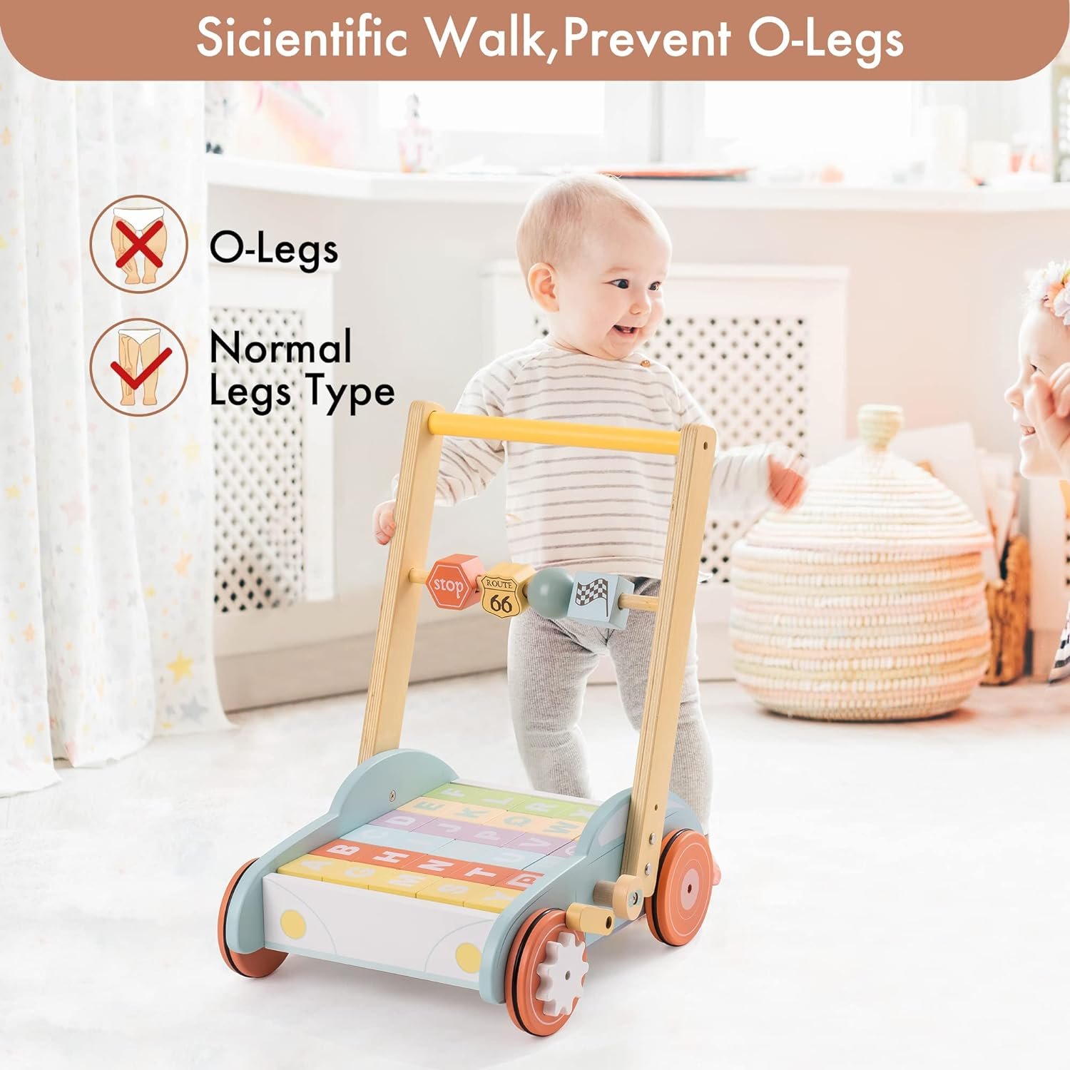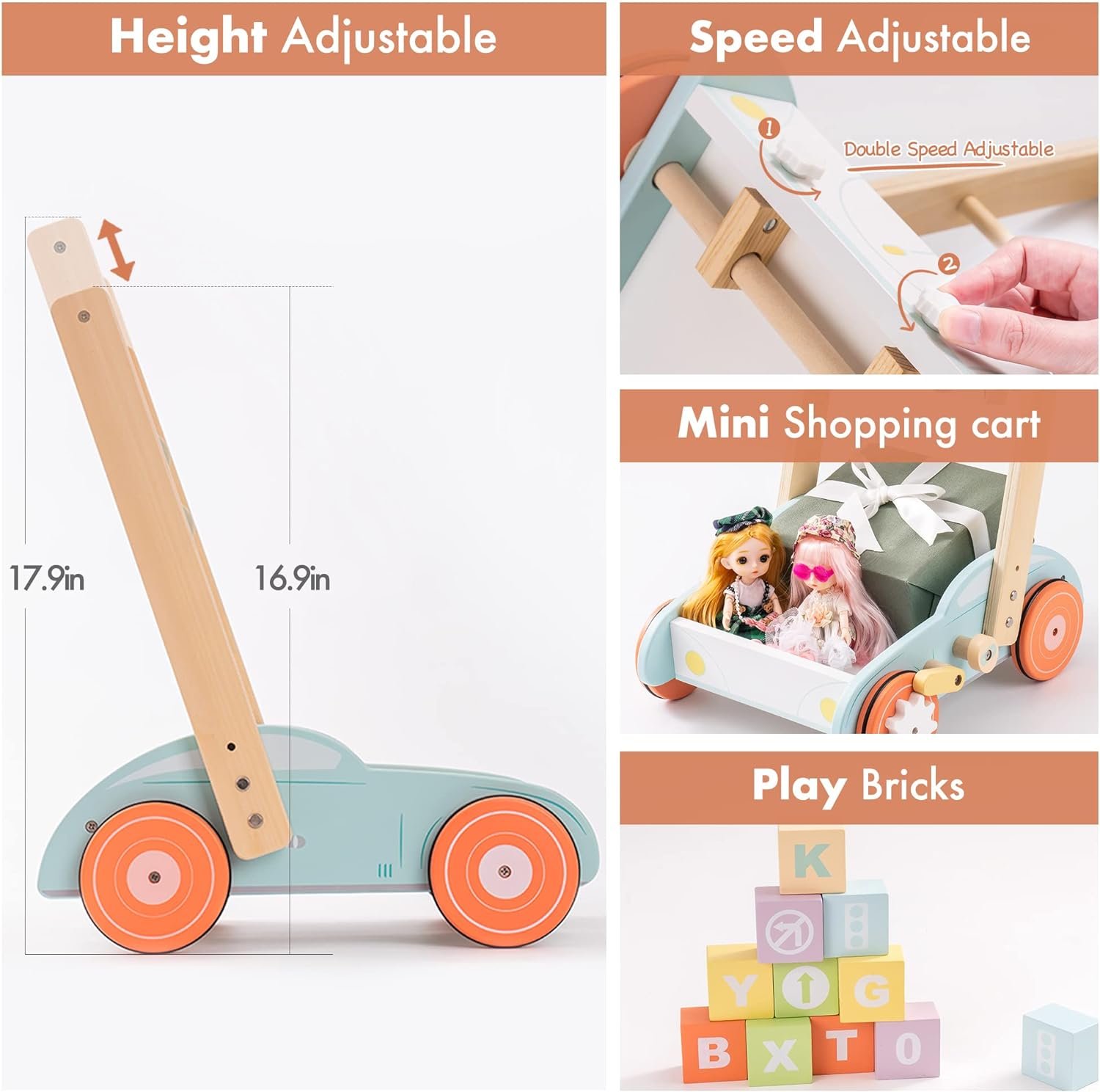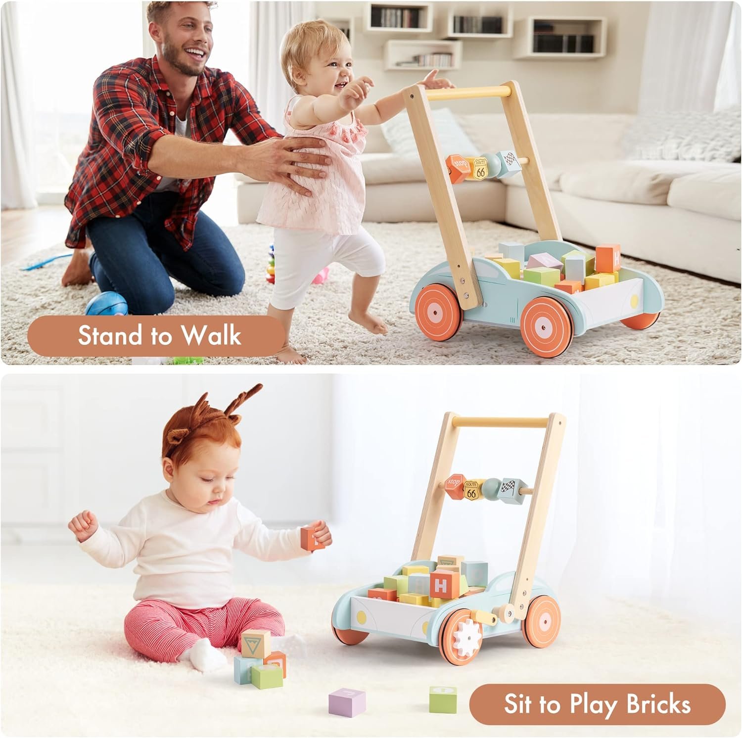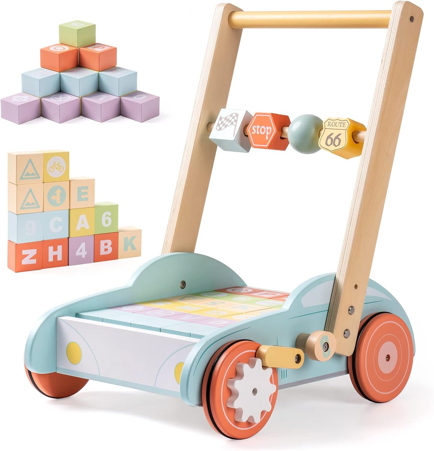 💟MULTIFUNCTION BABY PUSH WALKER:Purchase one and get 3 functional toys for your growing babies! The wood push walker is not only a learing to walker,but also comes with colorful bricks.Each brick is rich in numbers, letters, symbols and colors. To cultivate kids’s cognitive ability, it is neccessary to start from learning walker.Taking out the building blocks, activity walker is a super cute mini shopping cart