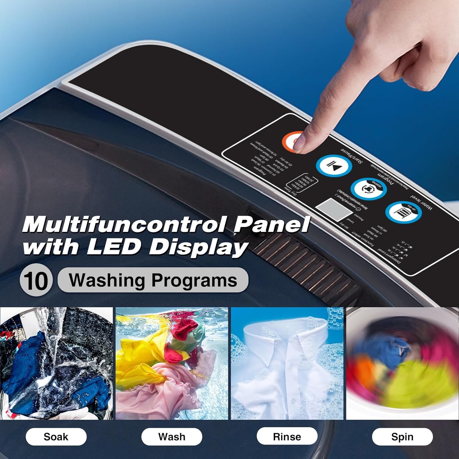 🌊 [10 Wash Programs and 8 Water Level] This portable washing machine has 10 programs: standard, soft, quick wash, heavy duty, soak wash, wash only, spin only, tub clean, tub air dry, and water recycle. 8 water levels: 1-2 is the minimum, 3-4 is low, 5-6 is middle and 7-8 is high. You can adjust different washing modes and control the water level. Different clothes have different washing and water level requirements, you can adjust them according to your needs.