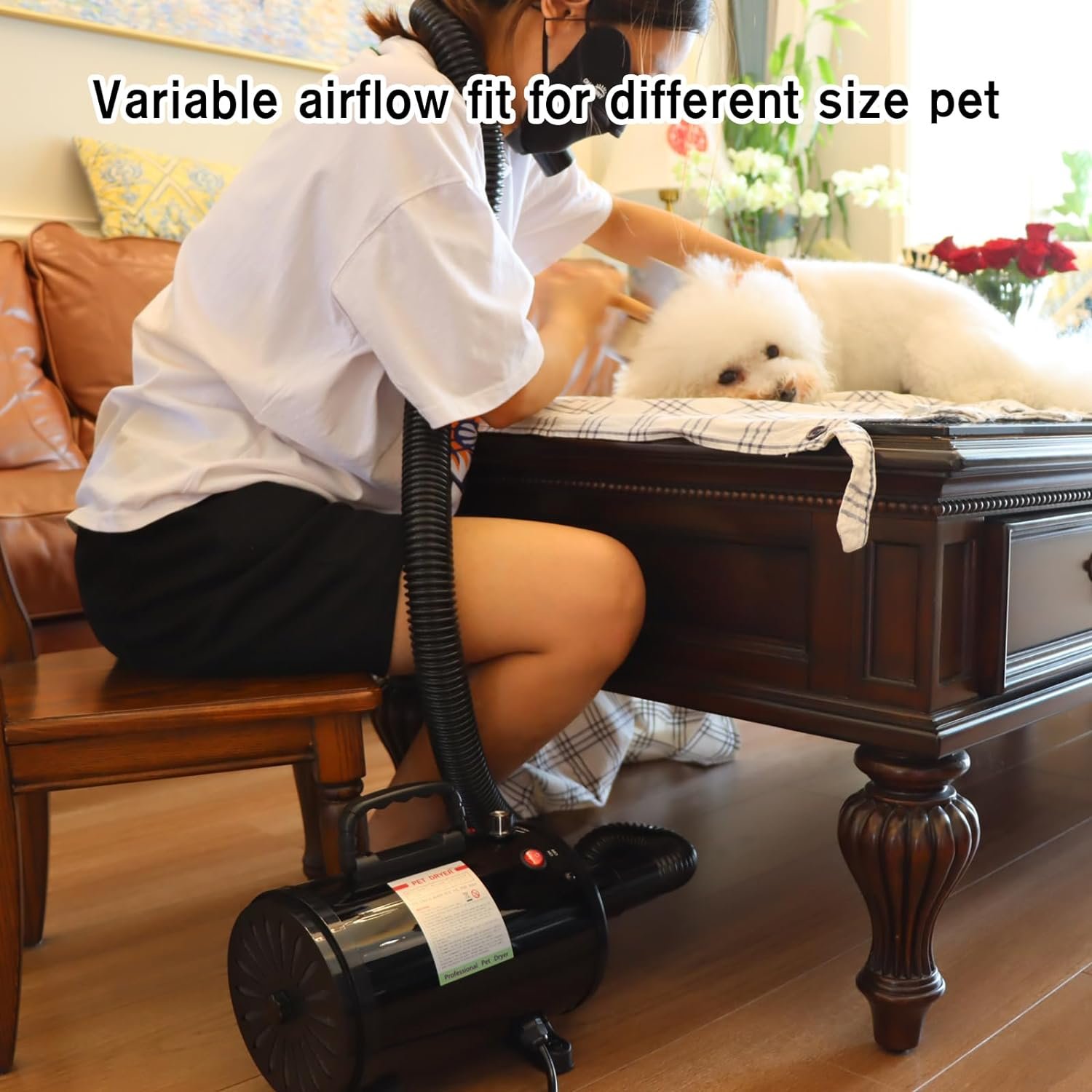 Variable airflow fit for different size pet: 30-90M/s, control the wind the dryer blow out by youself based on your pet size & fur. Started with the lowest air setting then turn it up a bit step by step, you can watch the mist of water being blown out of his hair then adjust the airflow. The sound is moderate loud but not ear crushing loud. Adjustable settings make it easy to choose different levels of drying for different types of coats, and fits for kitten cats to large dogs.