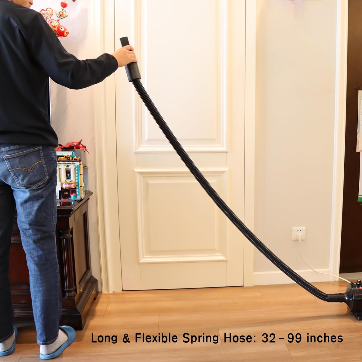 Flexible Spring Hose: 32-99 inches, flexible hose easy to reach around the pet especcially their face and ear . A handle on the end makes it comfortable to hold and your hand doesn’t get warm. Keep the hair blower away from the motor and only bring the hose/tube close to the dog especiaaly for ears and face dry which different from using a conventional hairdryer that may gets super loud and bothers your pet.