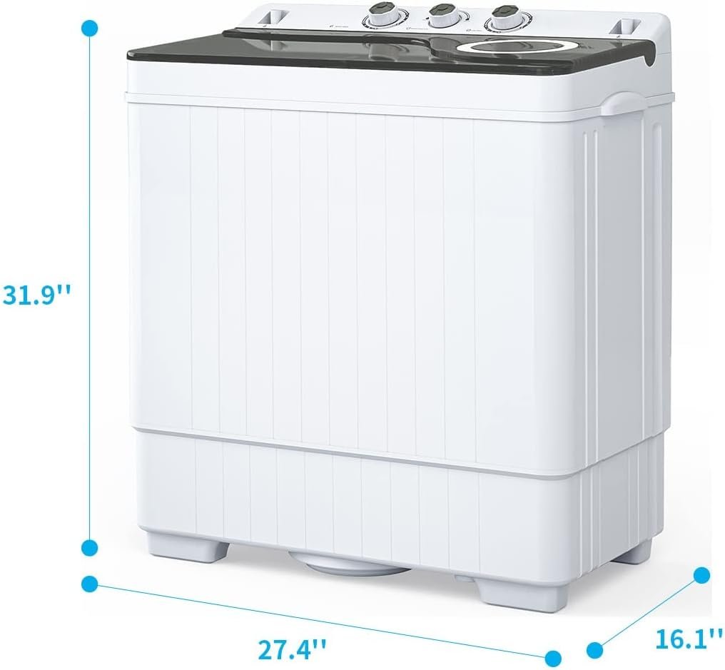 👗【Washing Capacity & Specifications】Total capacity:26 lbs(washer:18 lbs, spin cycle:8 lbs). Overall dimensions: 27.4* 16.1* 31.9 inches. Power supply: 110v/60hz, Total power: 420w(wash:280w/dry:140w). Easy operation design and easily movable. We do cover 1-Year warranty on it
