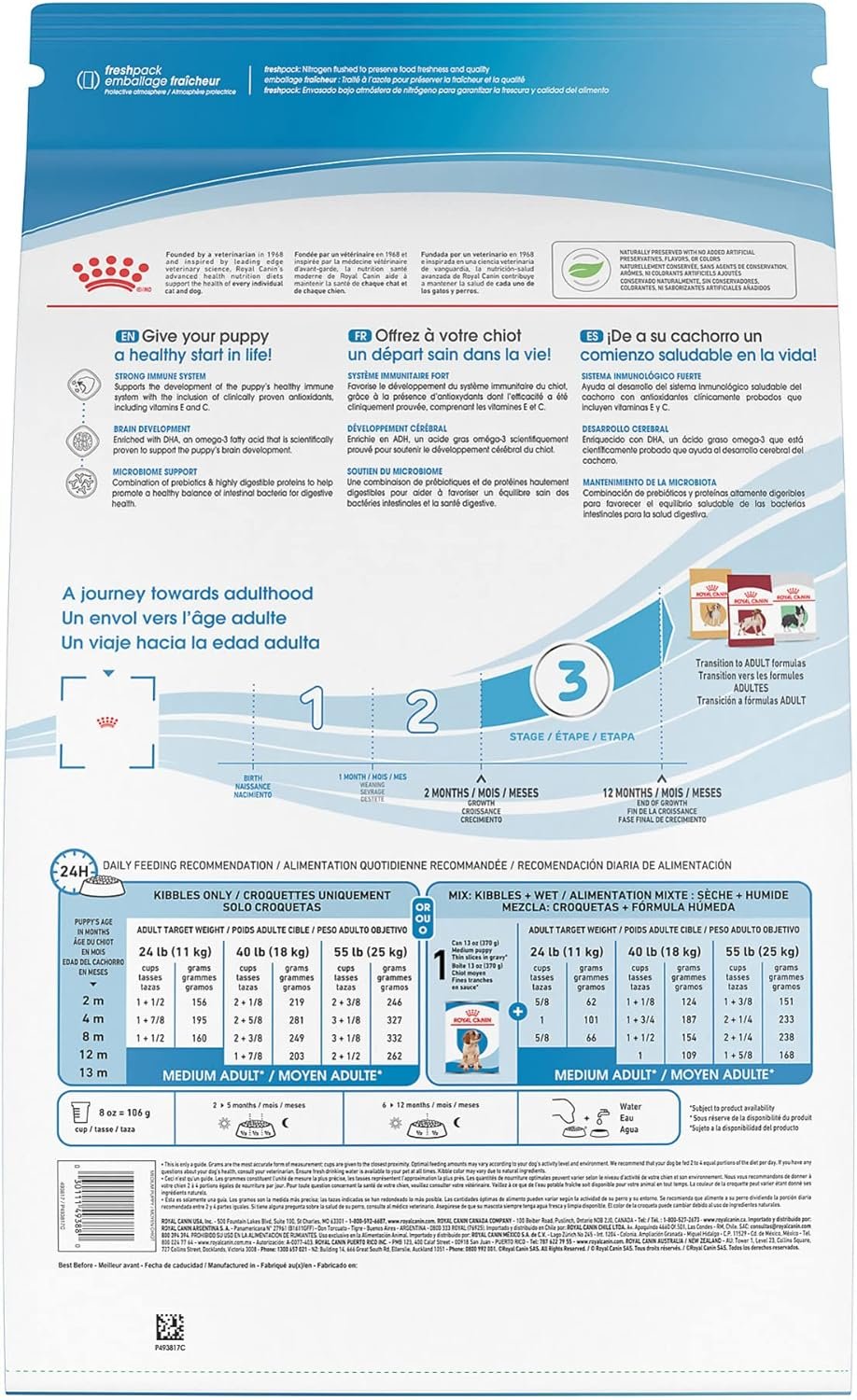 Serve up the targeted nutrition your puppy deserves with Royal Canin(R) Size Health Nutrition Medium Breed Dry Puppy Food. Royal Canin makes it easier than ever to feed your puppy dry food. This medium breed puppy food formula offers a crunchy dog kibble texture your puppy will love. Not only that, but this complete and balanced dry dog food provides the nutrition to support your puppy’s growth and development. DHA and omega-3 fatty acid in the healthy dog food help with your puppy’s brain development, while proteins, minerals and vitamins support a puppy’s high energy needs during growth. Antioxidants such as Vitamins E and C help with immune support, and a combination of prebiotics and highly digestible proteins promotes healthy digestion. Promote your puppy’s overall wellness with every Royal Canin Medium Breed Dry Puppy Food serving.