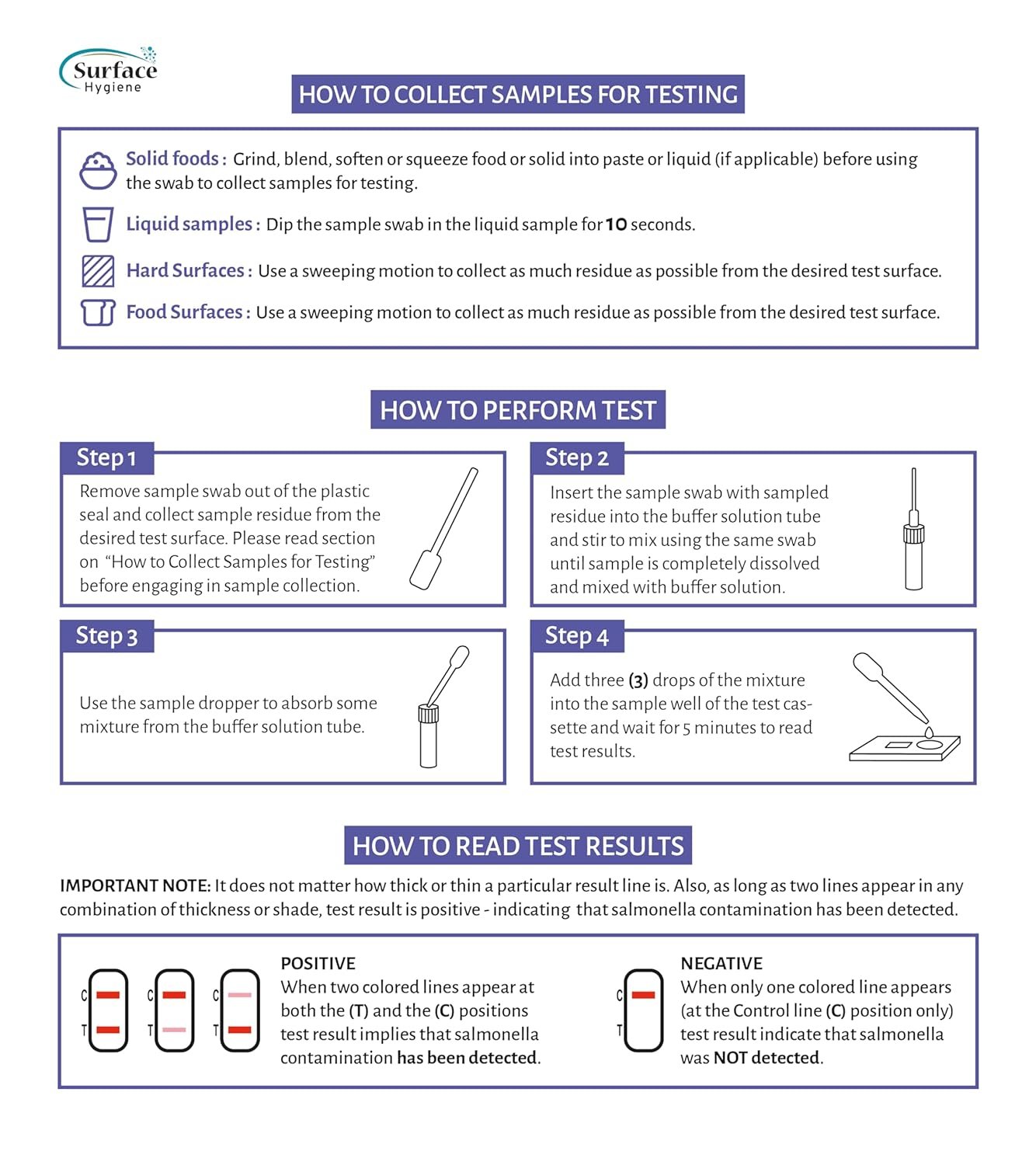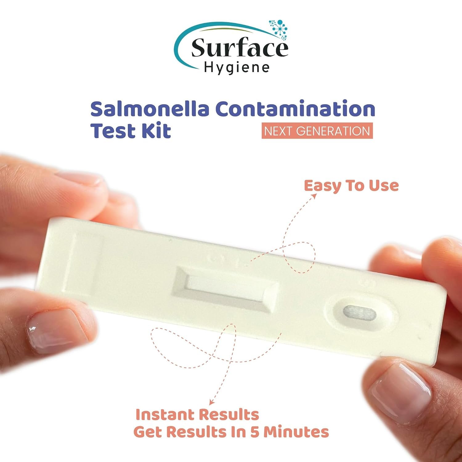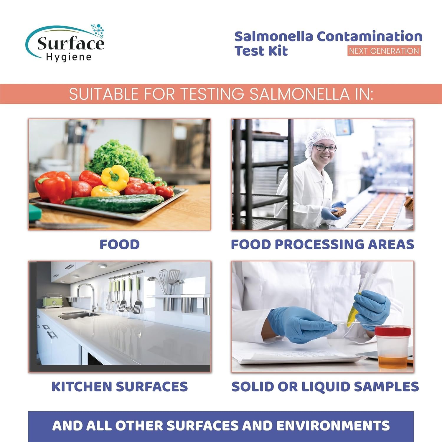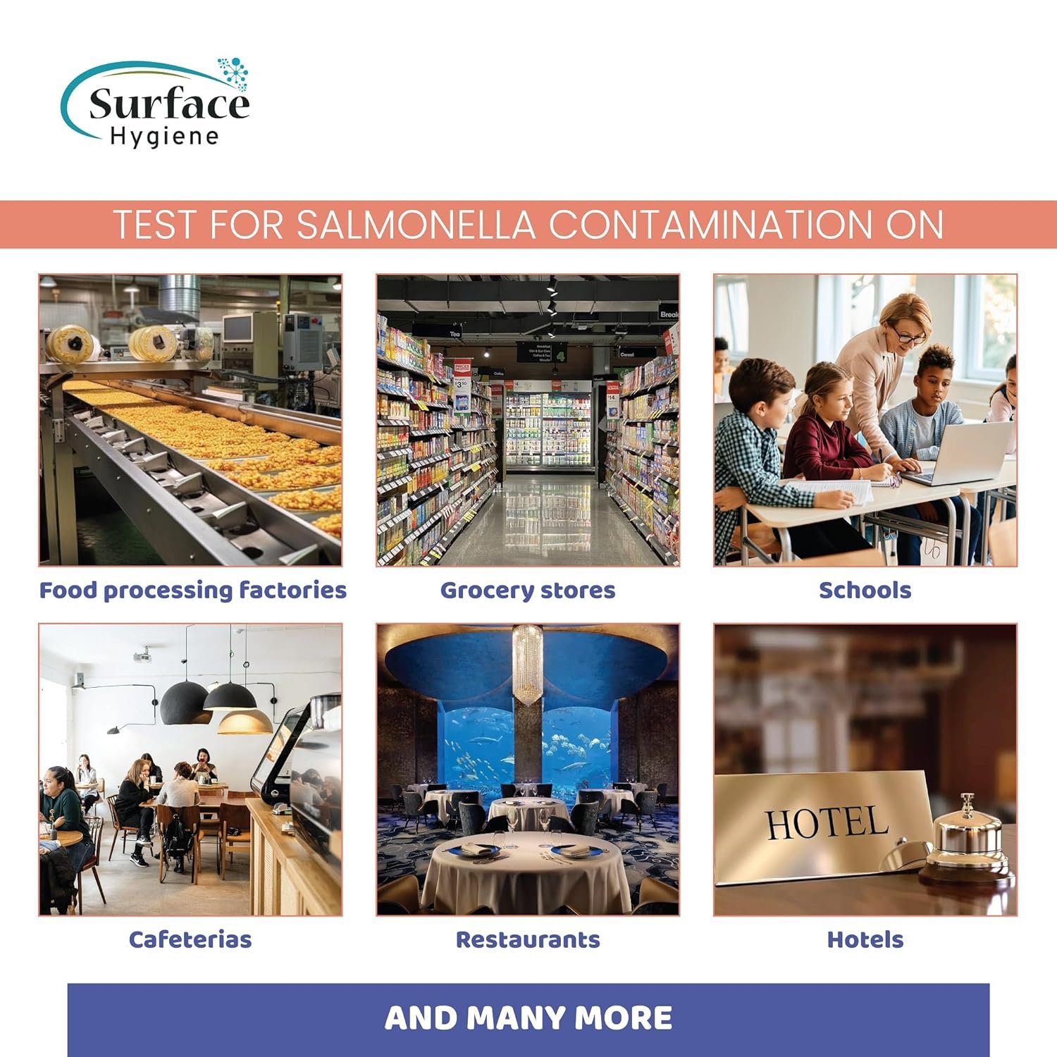 Test for salmonella contamination on surfaces at home kitchens, food processing factories, grocery stores, daycare centers, cafeterias, schools, restaurants and hotels.