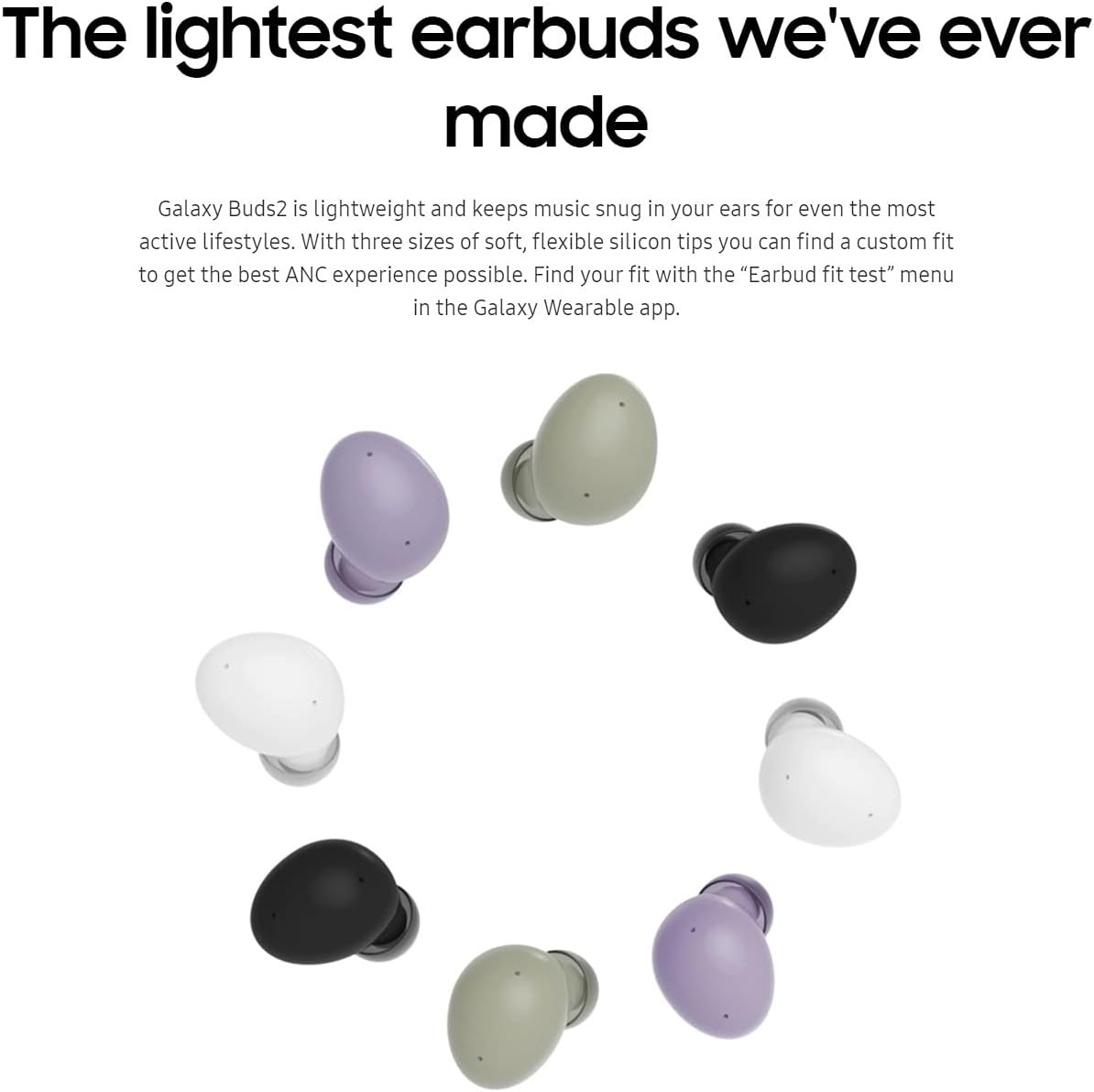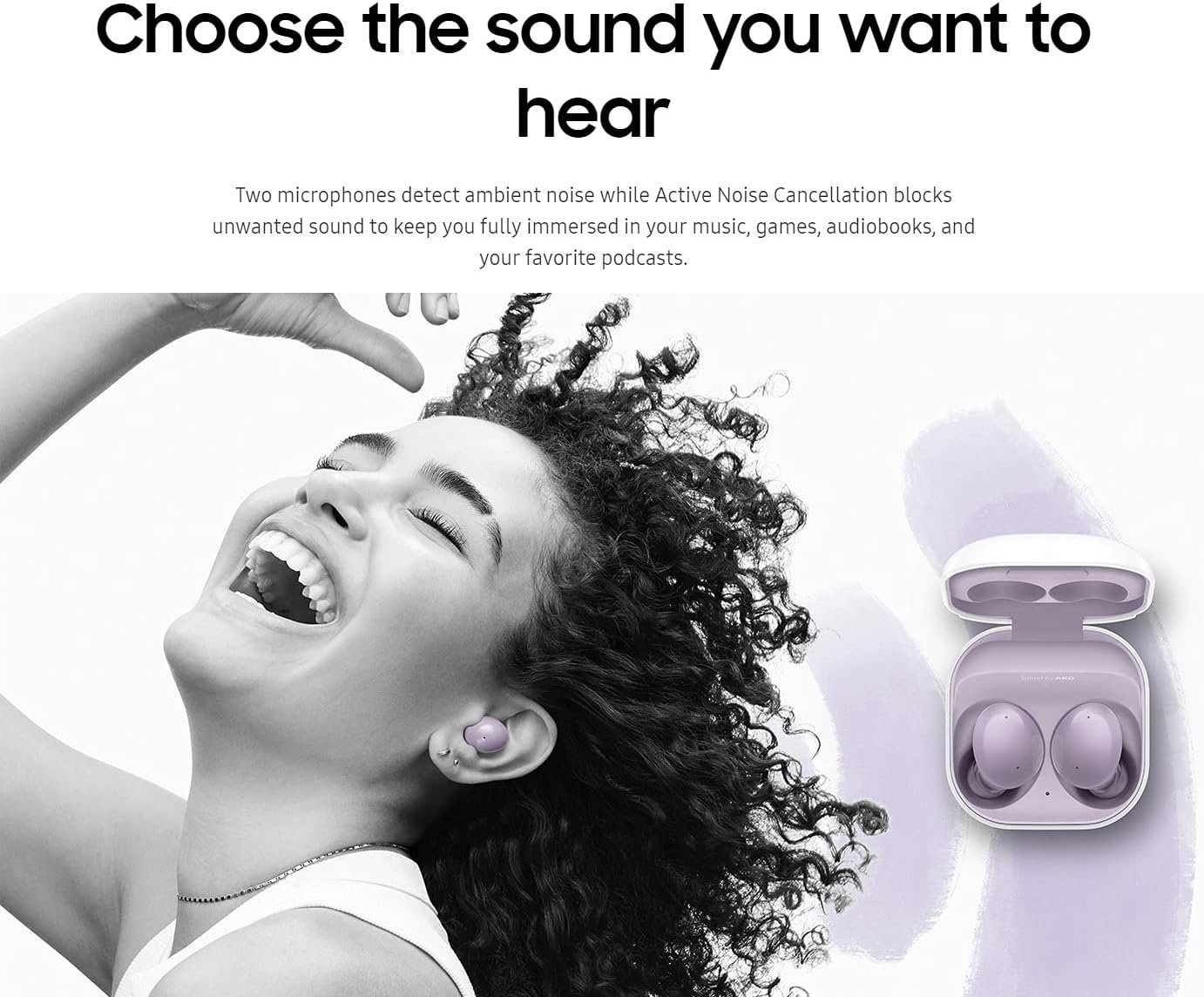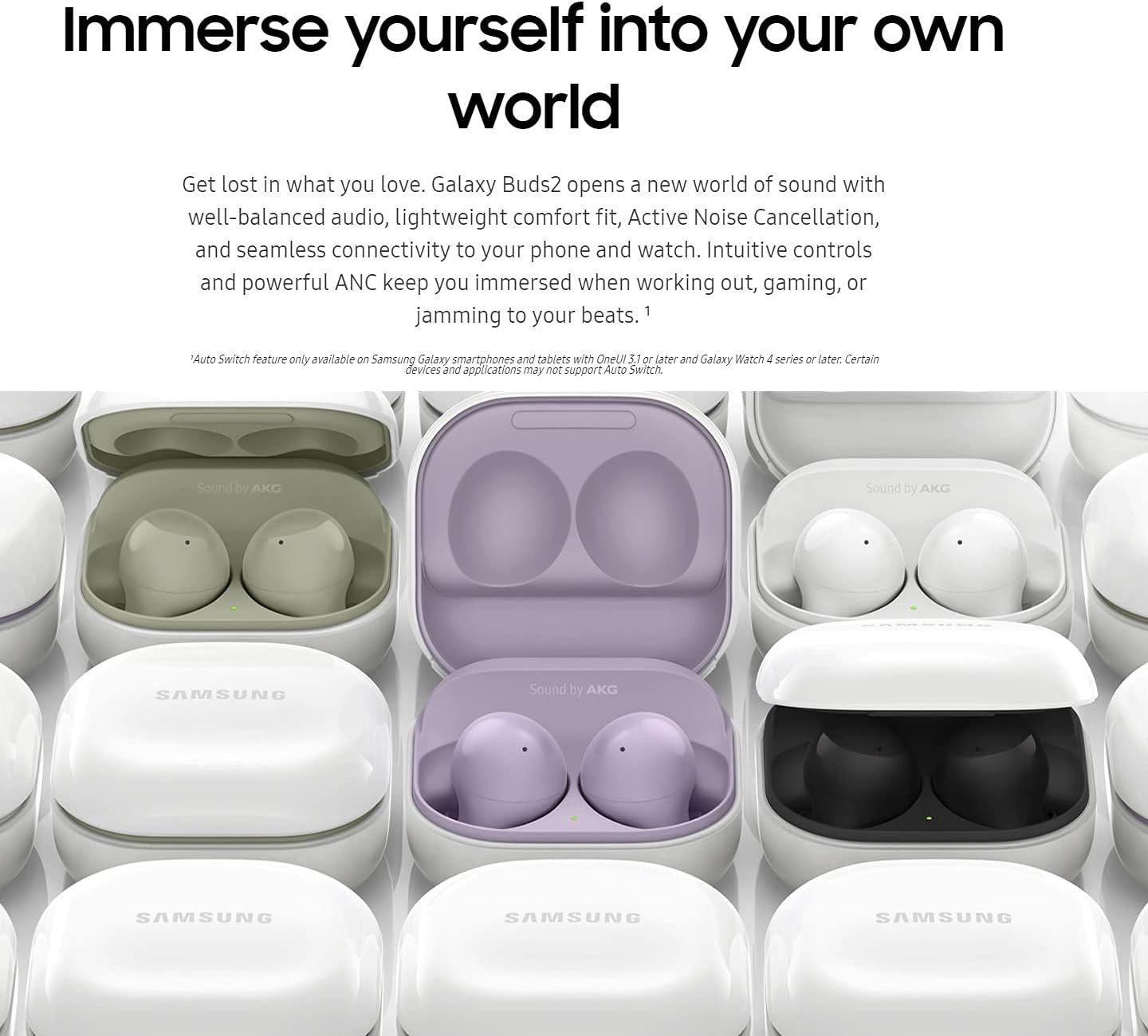Samsung Galaxy Buds2 is here, bringing a way for everyone to enjoy epic sound. With audio quality this good, you’ll feel the thump of every bassline and strum of every guitar right in your core — it’s like dropping you into your favorite band’s concert. Need to focus? Active Noise Cancellation and Ambient Sound control let you hear only what you want to hear. Enjoy some peace and quiet while you work from home or take calls without missing what’s happening around you. Featuring our slimmest and lightest design yet, Galaxy Buds2 fit so well, you may forget you’re wearing them — at least until the music starts. *Features including Active Noise Cancellation and Ambient Sound require a Bluetooth connection to a compatible device. *Advanced settings such as Ambient Noise Levels available only on Android devices running Android 7.0 or higher and 1.5GB RAM or above. Advanced features enabled through the Galaxy Wearable app on Android, available through the Google Play Store. *Actual battery life may vary and depend on usage conditions such as function settings, playback file type and Bluetooth signal strength. Play time may vary based on settings. *Wireless PowerShare limited to Samsung or other brand smartphones and accessories with WPC Qi wireless charging. *Touch Control available only on Android devices running Android 7.0 or higher and 1.5GB RAM or above. Galaxy Wearable app available through the Google Play Store. *Auto Switch feature only available on Galaxy smart phones and tablets with Samsung OneUI 3.1 or later. Certain applications may not support Auto Switch. Galaxy devices must be logged in to Samsung Account to enable Auto Switch. One-Step Connection feature only supported on devices running Samsung One UI 3.1 or later.