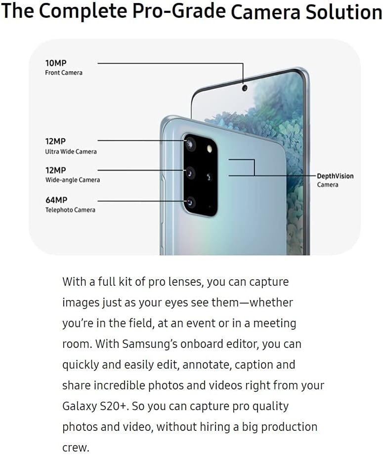 Behold the Samsung Galaxy S20+ SM-G986U, a marvel that transcends the ordinary, blending raw power with refined elegance. Immerse yourself in a breathtaking visual spectacle on its expansive display, where every pixel dances with vivid brilliance. The Galaxy S20+’s cutting-edge camera system is your passport to an extraordinary visual journey, transforming mundane scenes into captivating masterpieces. Fueled by an indomitable processor, it orchestrates seamless performance, effortlessly adapting to the rhythm of your dynamic lifestyle. With a battery that rivals the energy of your day, the Galaxy S20+ becomes your trusted ally, simplifying your daily hustle with intuitive features. Step into the boundless realm of the Samsung ecosystem, where innovation meets simplicity through an interface designed for seamless exploration. This sleek and resilient device is more than a phone; it’s a sophisticated companion, offering a comprehensive smartphone experience that weaves together the threads of innovation and practicality. Elevate your mobile journey to the extraordinary with the Samsung Galaxy S20+ SM-G986U, where technology becomes a captivating symphony of simplicity and sophistication. Our carefully inspected and tested Manufacturer refurbished products assure full functionality, having undergone a comprehensive examination. While they may exhibit signs of light to moderate usage, each unit is certified as functional by Phonecheck, an industry-certified, leading stringent quality control and diagnostics examination. Moreover, our commitment to quality extends to a thorough cleaning process. Please note that each shipment may arrive in a brown or white generic box, accompanied by relevant charging accessories (please be aware that headphones are not included), which may also be generic. Our top priority throughout this refurbishment process is your reliable performance and quality assurance.