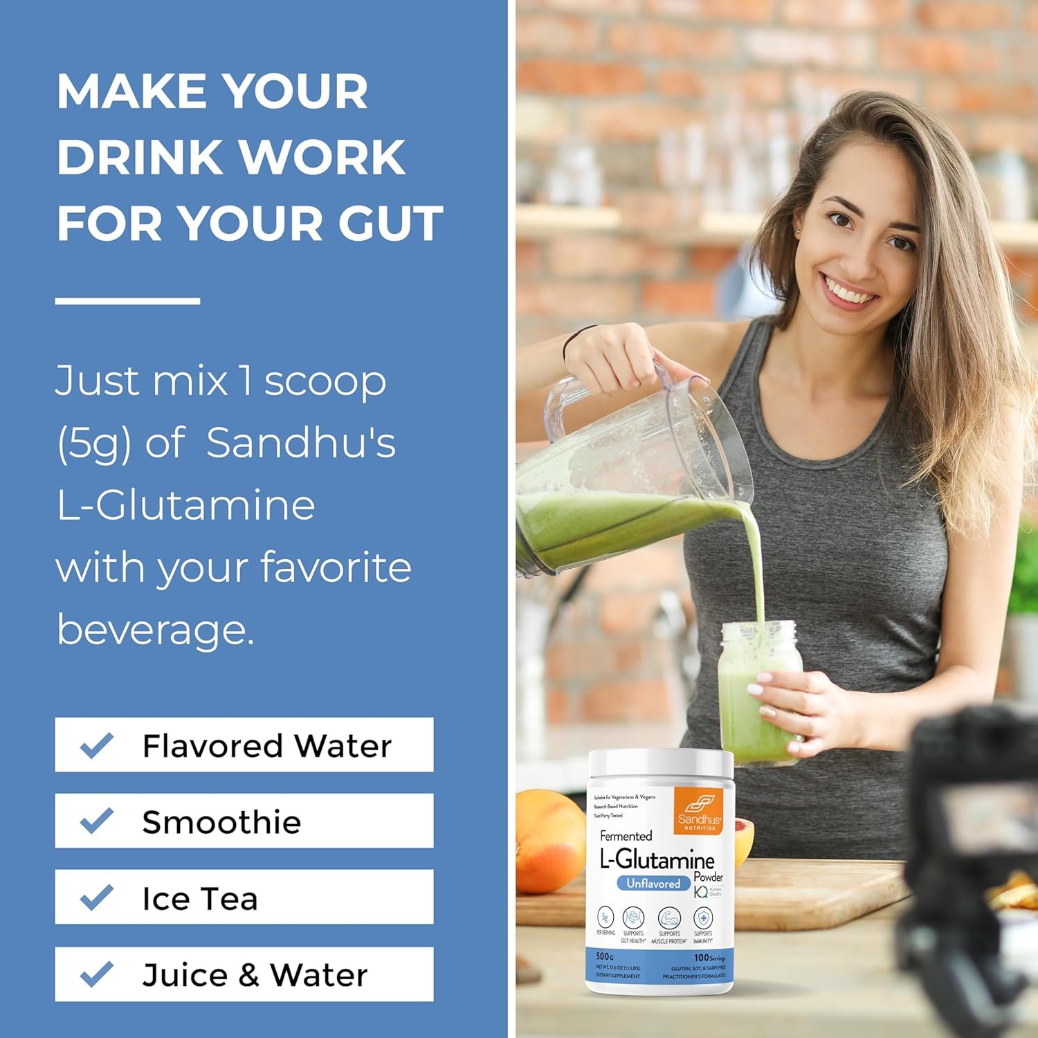 L-Glutamine : BENEFITS & USE: Sandhu’s fermented L-Glutamine supports healthy gut lining*. And helps maintain gut health in both men and women with a sensitive gut. It also supports muscle protein and immunity