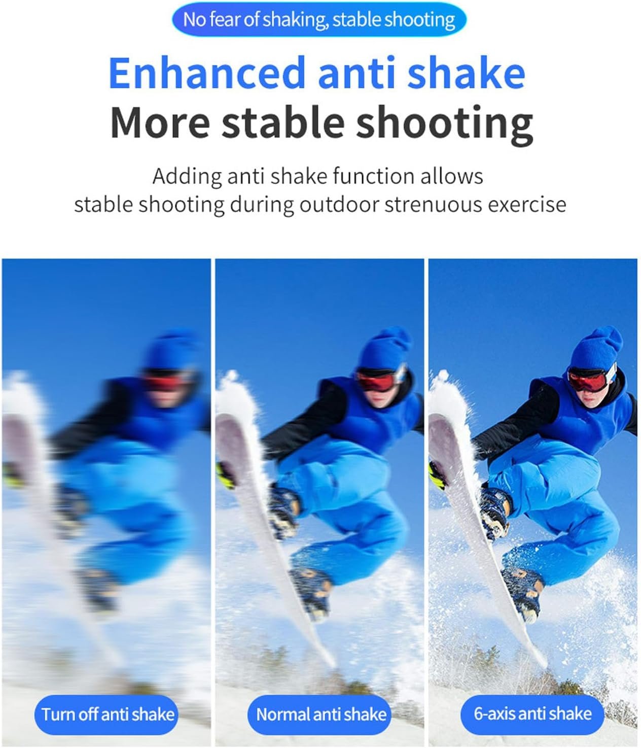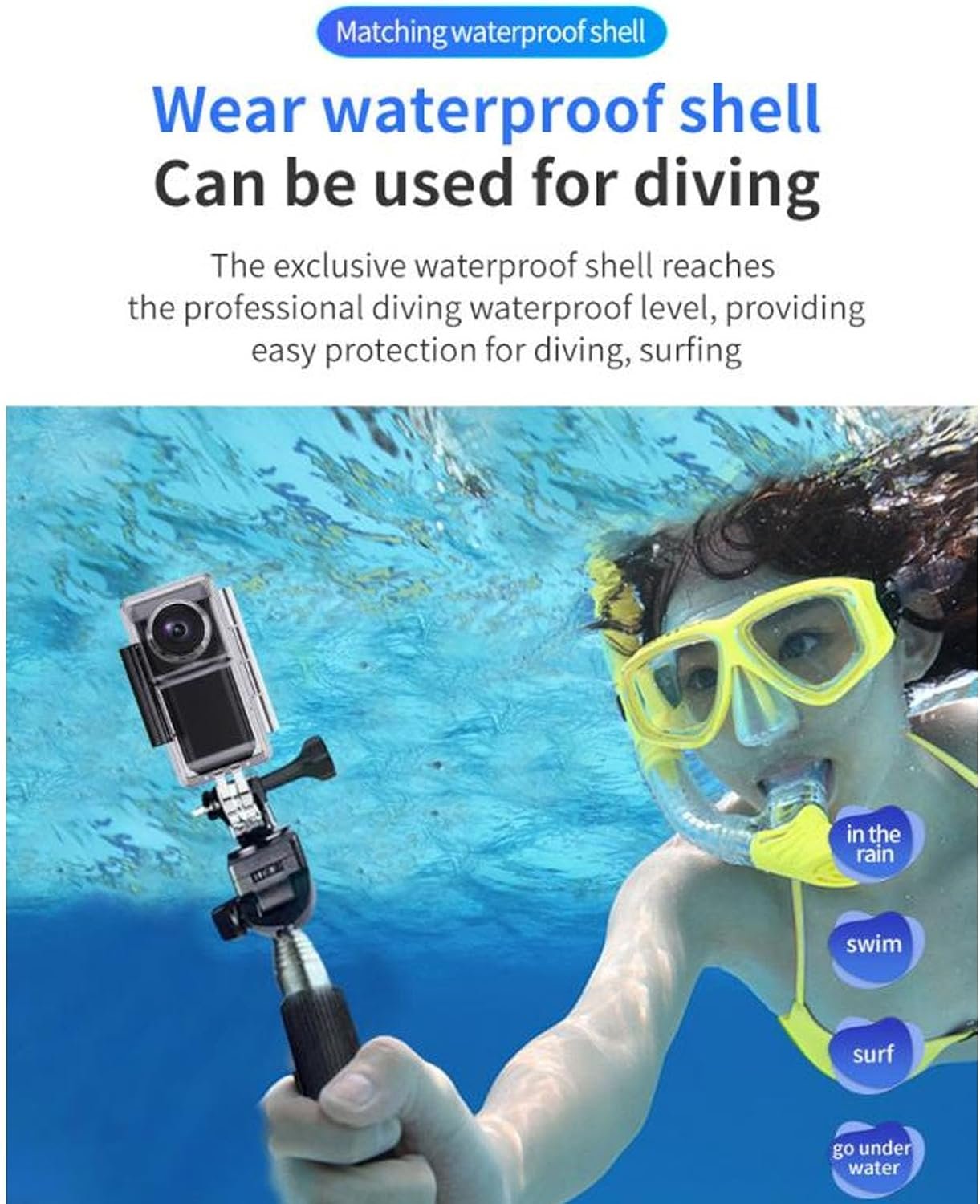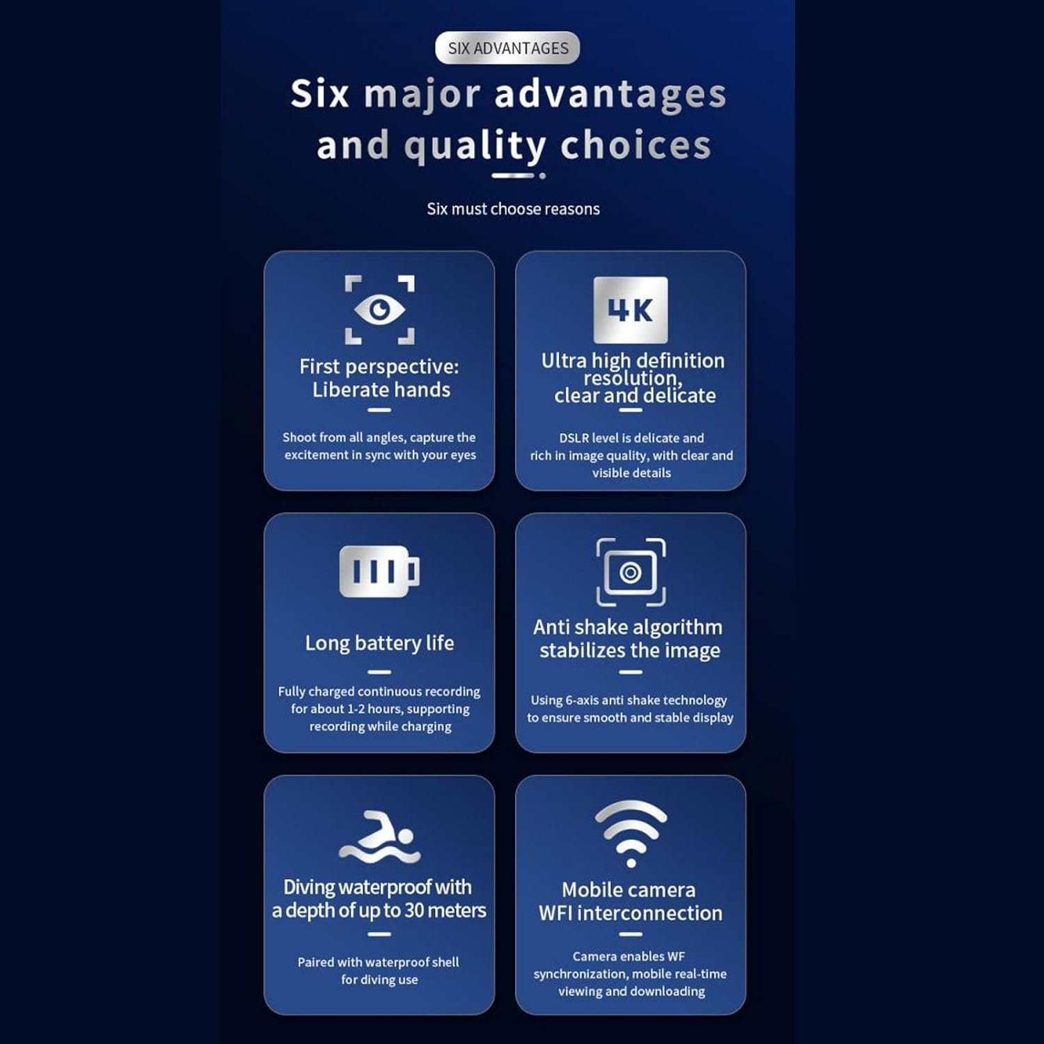 WATERPROOF AND SHAKEPROOF: Built in 6 axes shakeproof gyroscope, can ensure the stability of the image in active movement or shaking environment. And the sports camera material is excellent water resistance, waterproof up to 30 meters deep, whether is swimming, diving or rain recording, the camera performance will not be damaged