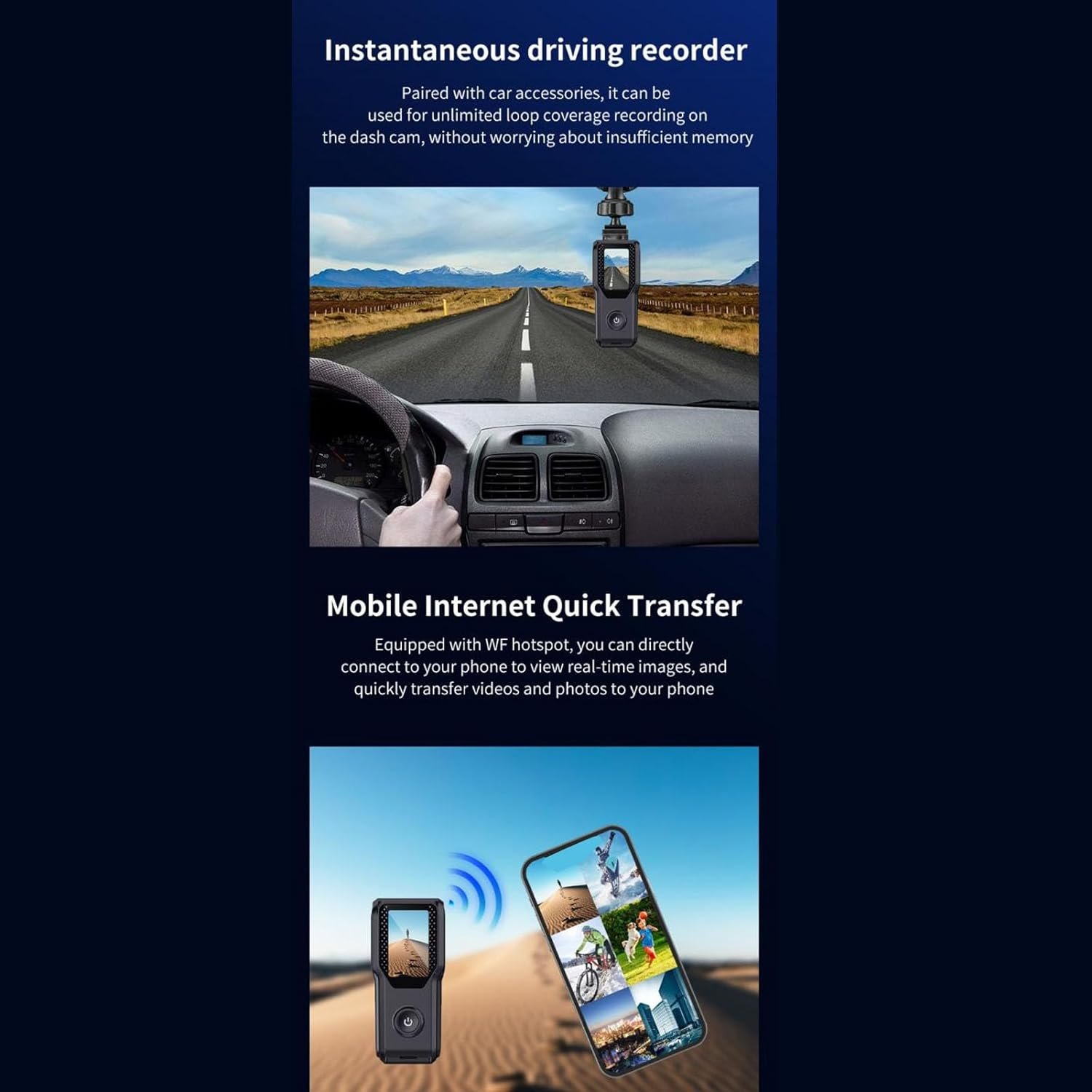 Wireless WiFi: Support, for IBK CAM app(view real time footage, quickly transfer videos, photos to phone)