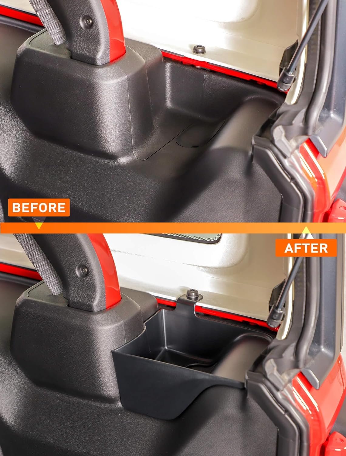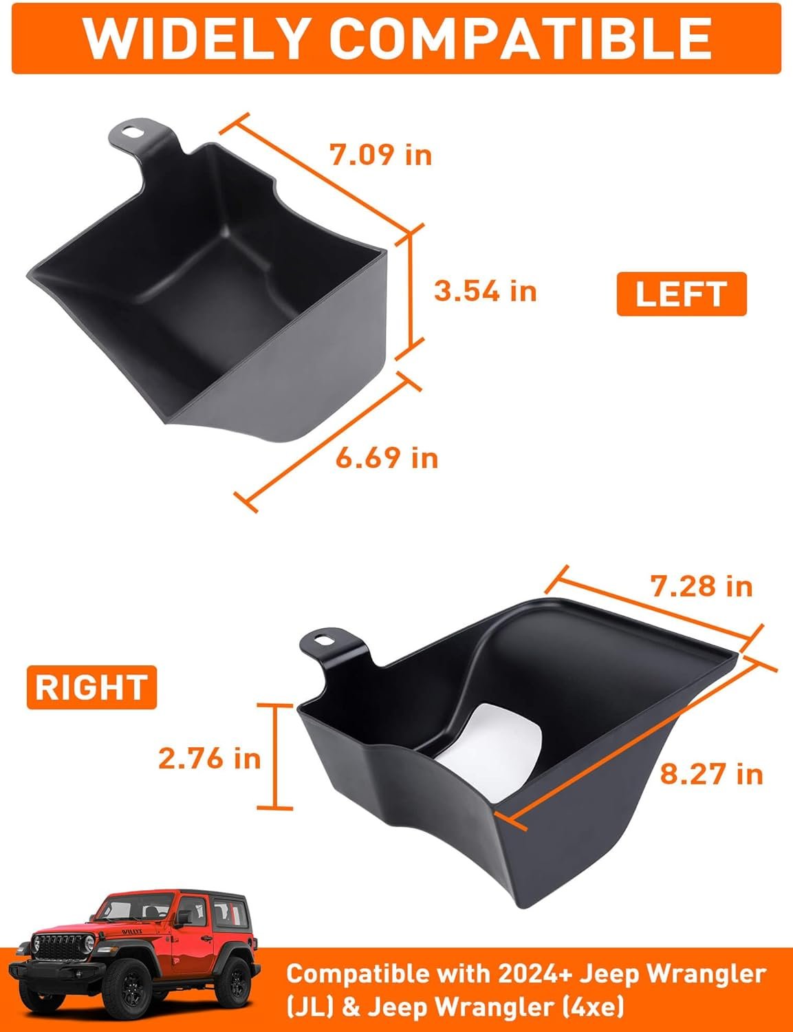 Compatible Models Jeep Wrangler (JL) and Jeep Wrangler (4xe) Years 2024+ Specific Models Sahara, Sport, Sport S, Rubicon, Rubicon X, Rubicon 392, Willys, High Altitude etc. Material Acrylonitrile Butadiene Styrene Installation Screw installation, automotive double-sided tape auxiliary fixation Special Design The passenger side storage box has a slotted design for easy removal of the taillight
