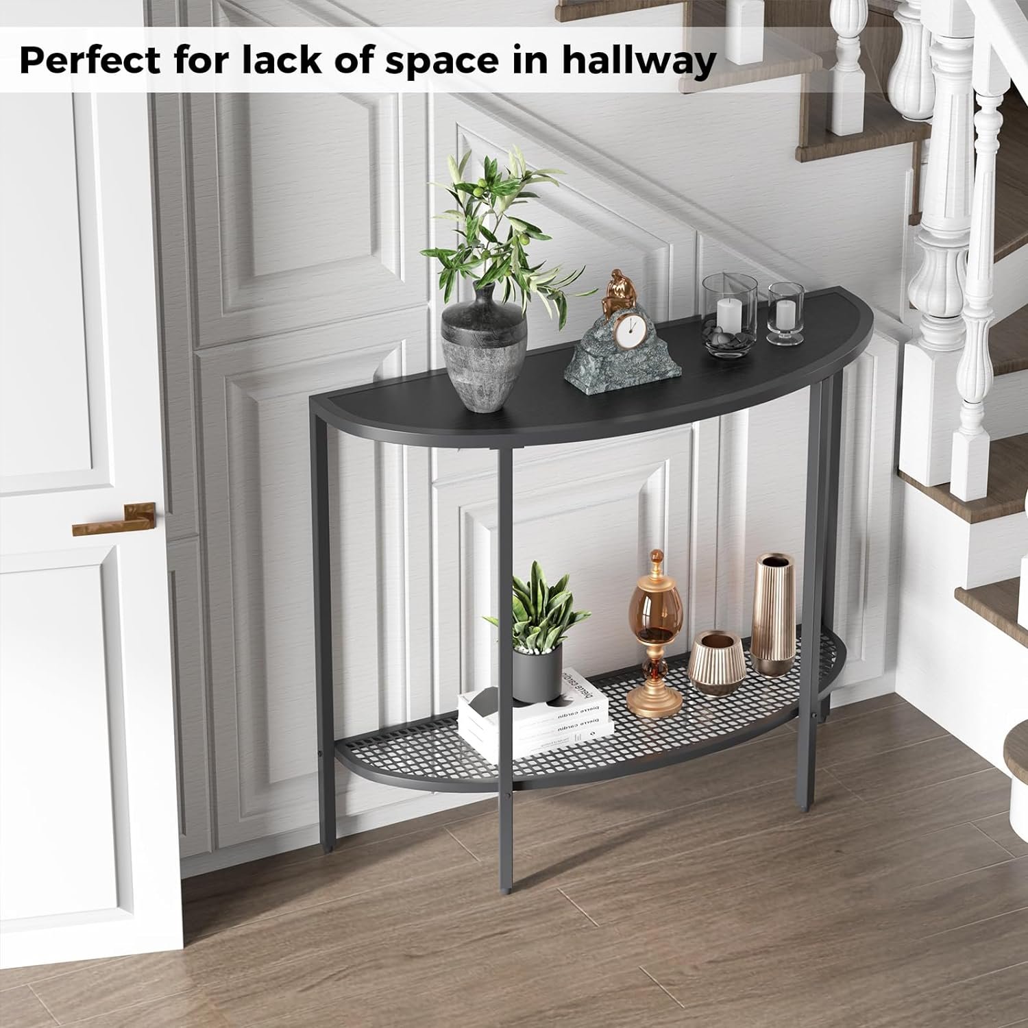【Unique Semicircle Look】Smooth round edge is much safer than sharp square corners. 2 tier design with industrial black wood top panel and mesh shelves provides spacious storage space, making your space cleaner and tidier.