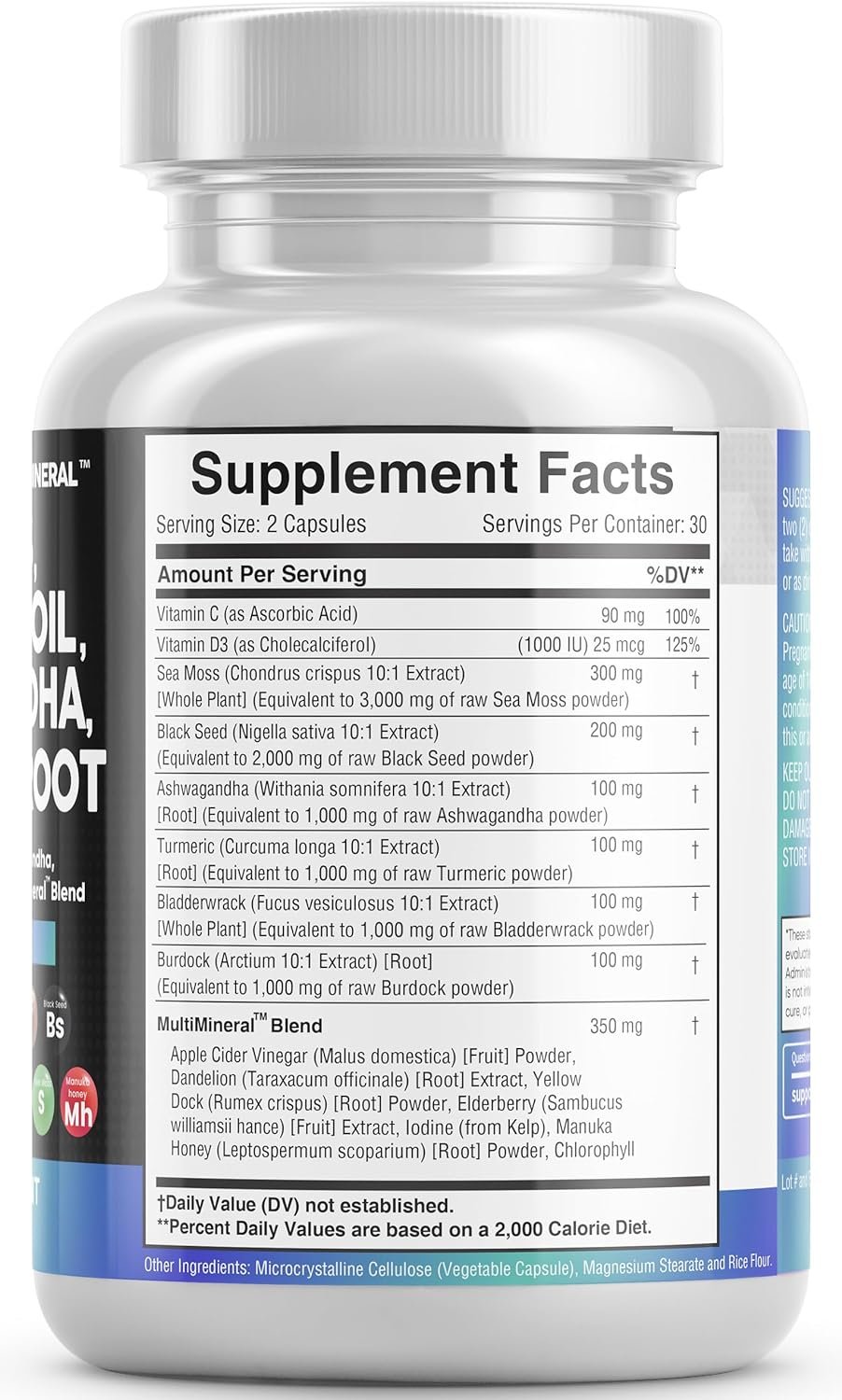 Introducing the MultiMineral Blend – Sea Moss Pills, Black Seed Oil Pills, Ashwagandha Root, Bladderwrack Capsules and Burdock Root Capsules that contain 10+ powerhouse ingredients, turmeric curcumin capsules, Apple Cider Vinegar, Chlorophyll, Manuka Honey, and more! These sea moss bladderwrack burdock root capsules are alternatives to sea moss gummies, black seed oil gummies, and ashwagandha gummies for men. Not usual sea moss raw organic, wildcrafted sea moss gel or ashwagandha supplements.