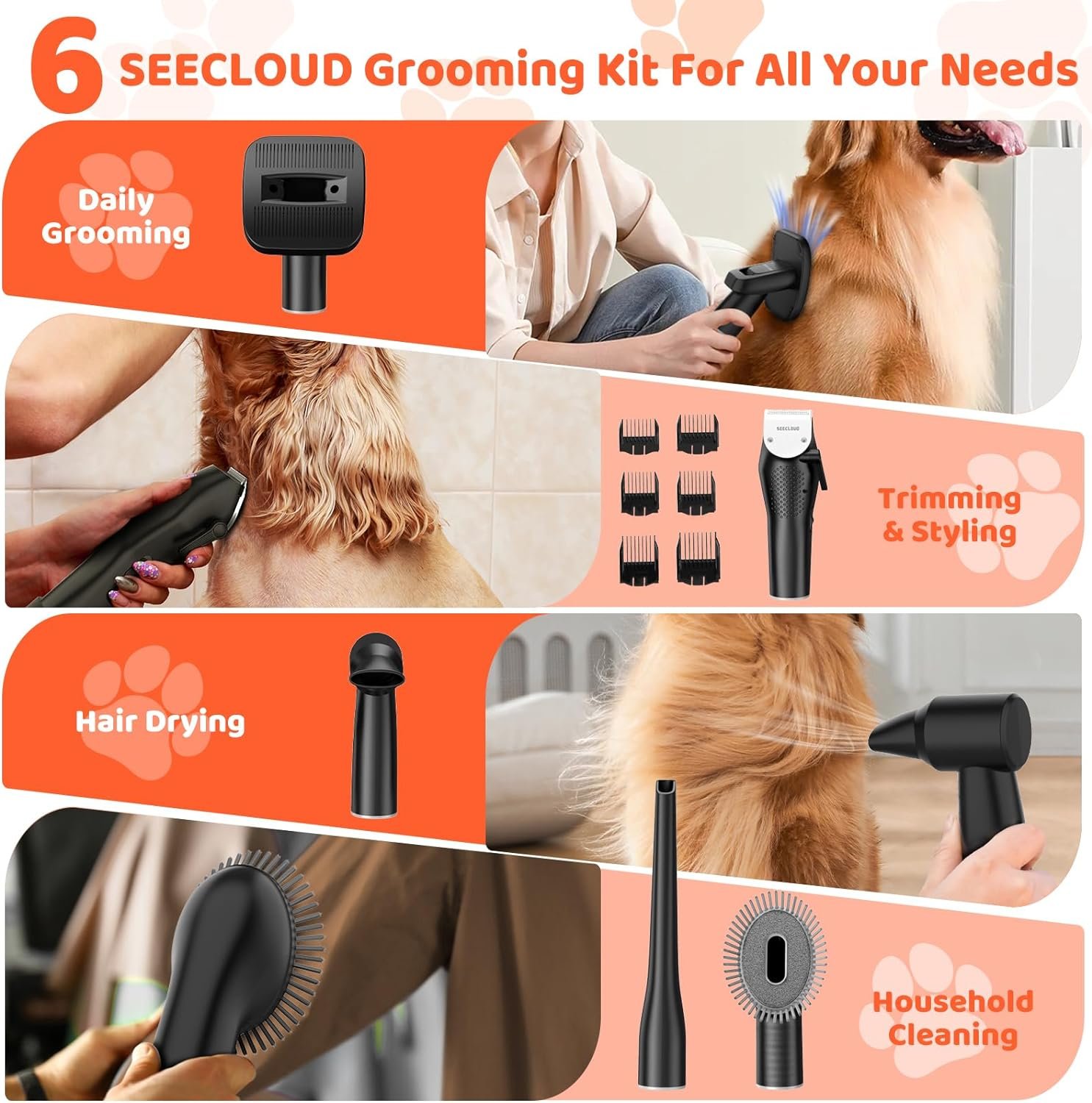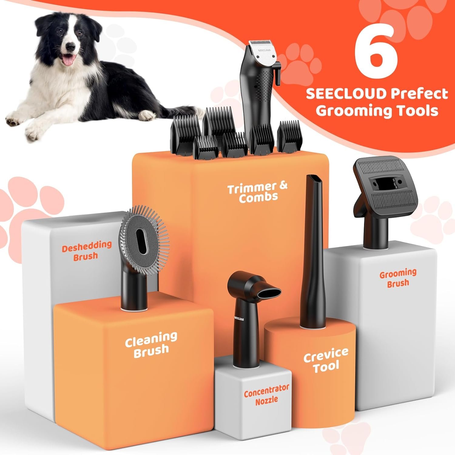 PET VACUUM WITH 6 PROFESSIONAL TOOLS – SEECLOUD vacuum cleaner pet hair 6-in-1 grooming kit designed to cater to various grooming requirements. The concentrator nozzle efficiently dries your dog’s coat post-bathing. The trimmer and accompanying 6 combs allow you to effortlessly create your dog’s preferred style. The grooming brush and deshedding brush effectively eliminate excess hair. The crevice tool and cleaning brush effectively gather stray hairs from clothing and household surfaces.