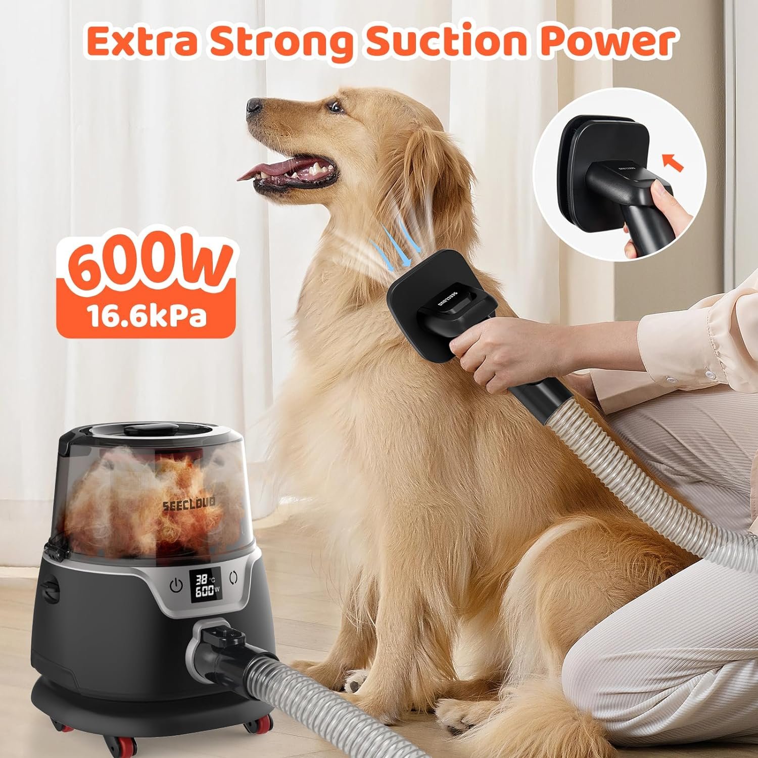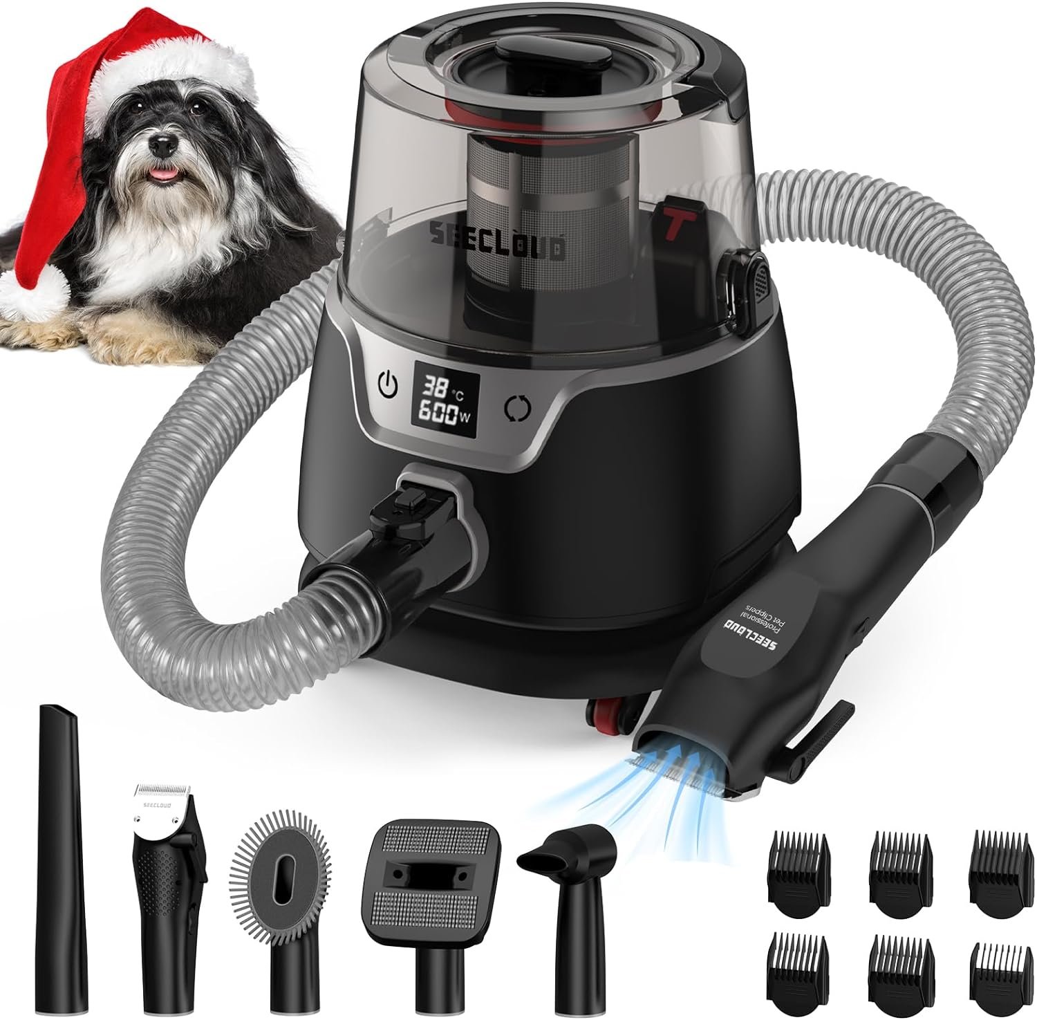 600W SUPER POWER – While ordinary dog grooming clippers often leave behind a trail of mess and scattered hair, our pet grooming vacuum boasting an impressive 600W super power. SEECLOUD dog grooming vacuum for shedding with 6 adjustable power levels at your disposal, you have the flexibility to select the perfect setting for your furry companions. Rest assured, even pets with thick and dense coats can be groomed effortlessly, thanks to the remarkable suction power of up to 16.6Kpa.