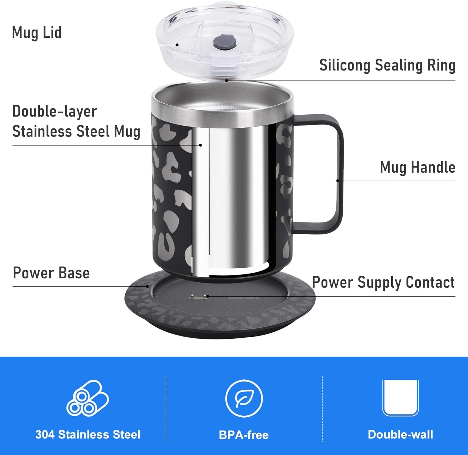 The heated mug made of 304 stainless steel,BPA-free,sleek and rugged,Scratch resistant,easy to clean,mug lid with food-grade silicone sealing ring, maximum leakage and dustproof,you can put a straw or open to drink directly.