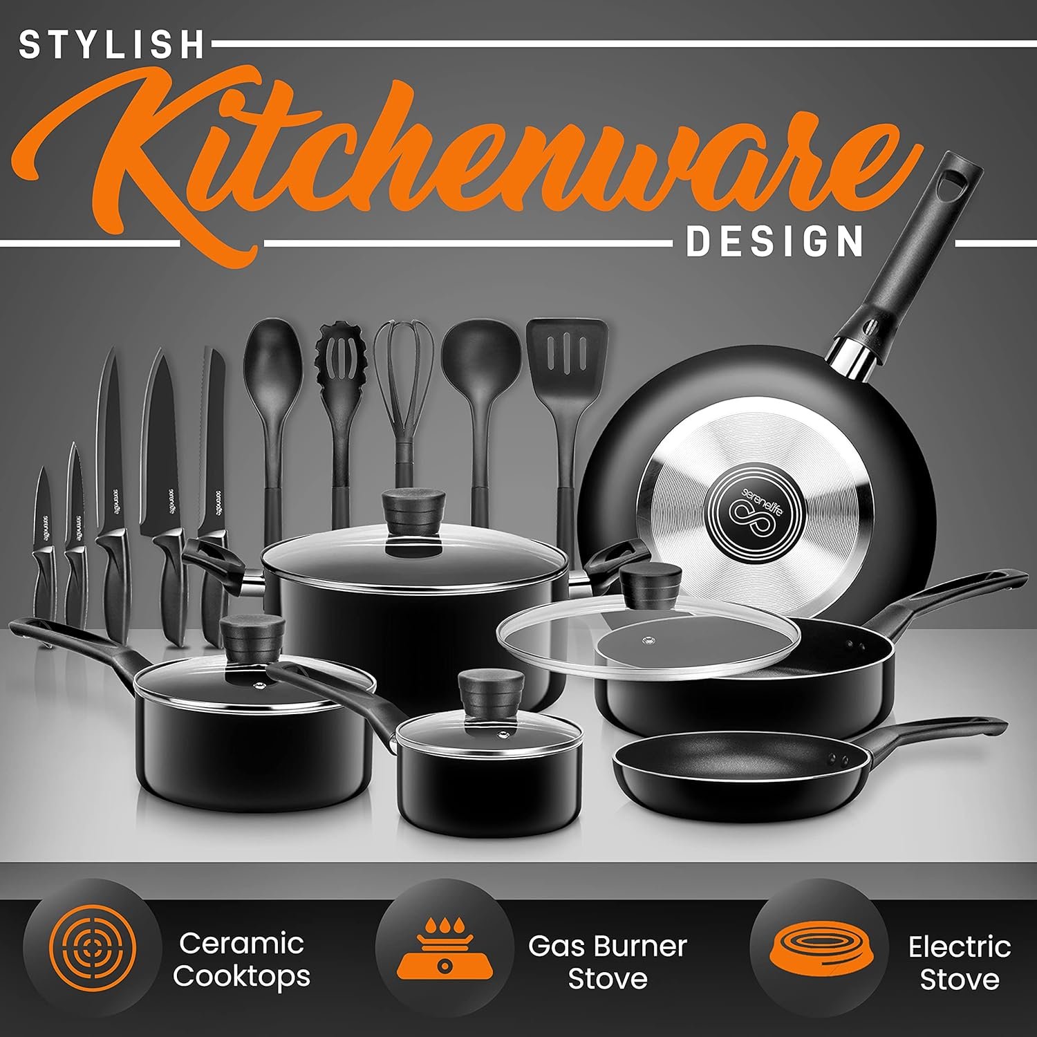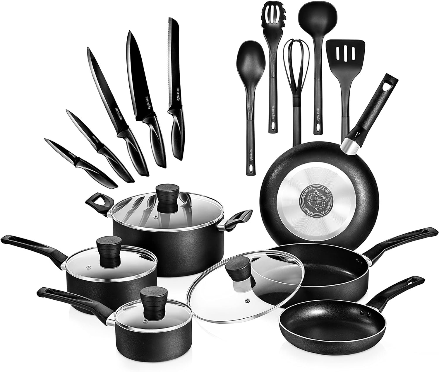 20-PIECE SET: The SereneLife Cookware Set features 20pc nonstick set which includes 0.89 & 1.90qt sauce pots w/ lids, 4.70qt dutch oven pot w/ lid, 2.5qt saute pan w/ lid, 8” & 10” fry pans, spoon, spatula, pasta server, ladle, whisk, and a knife set