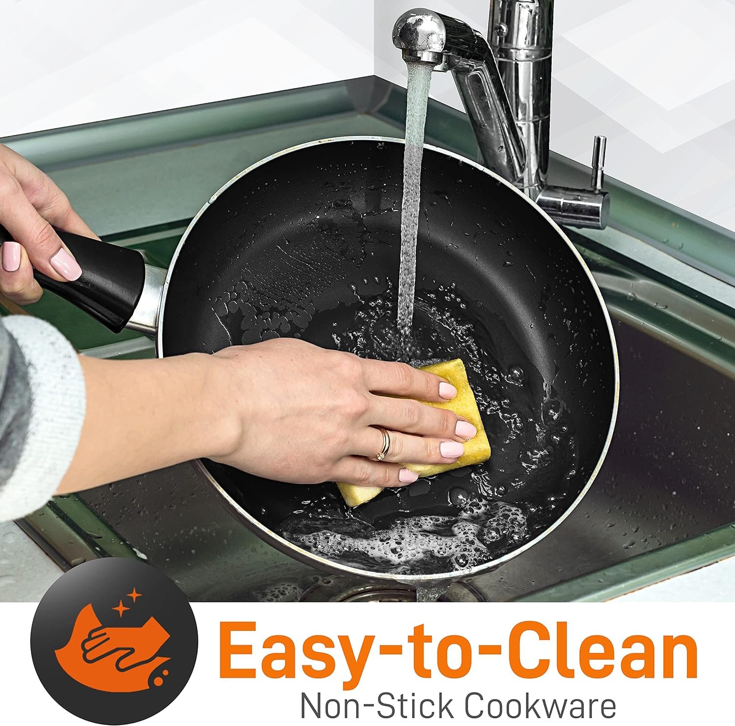 NON-STICK SURFACE: This cookware set boasts a durable, PFOA/PFOS-free non-stick coating, ensuring effortless food release, easy cleaning, and healthier cooking. Its heat-resistant lacquer exterior stands up well to high temperatures.