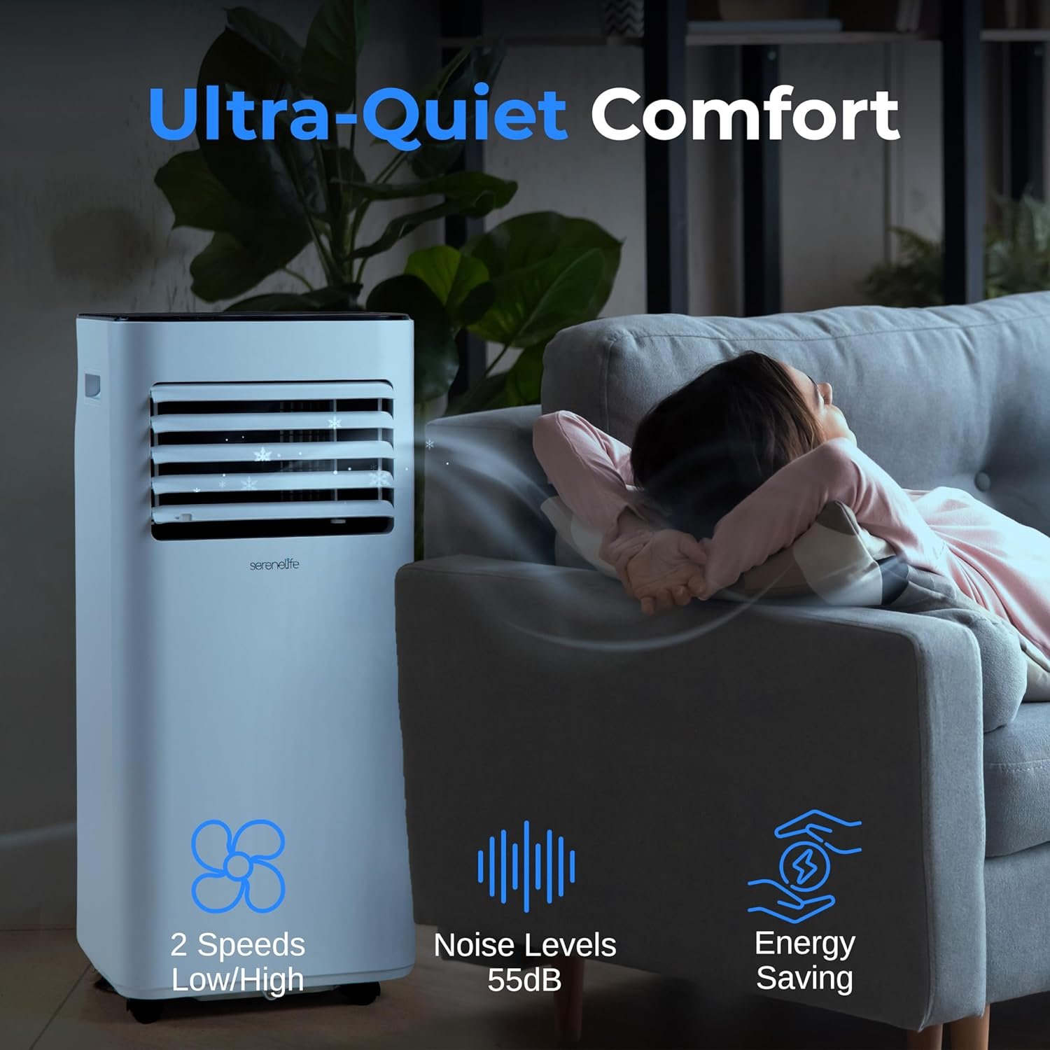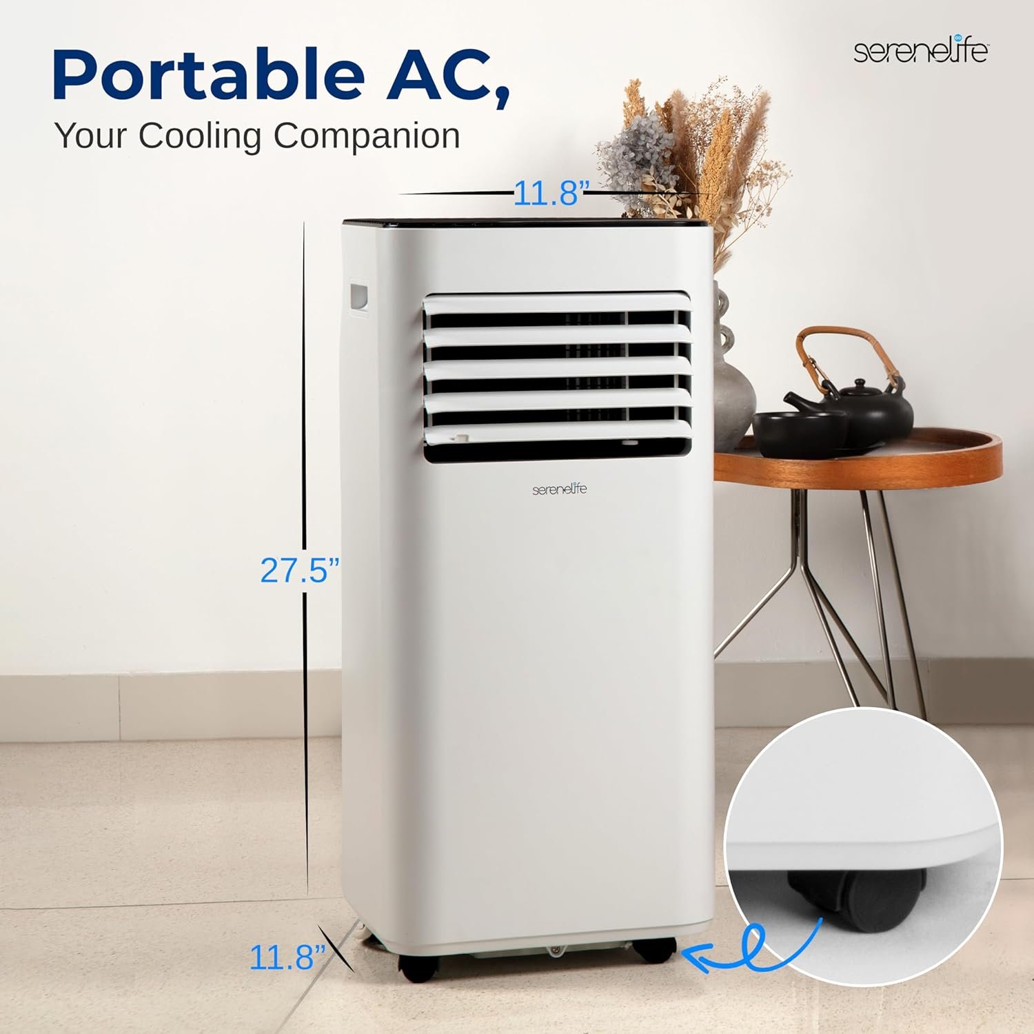 Introducing the Serenelife Compact Portable Air Conditioner, an innovative solution designed for optimal cooling efficiency and versatile climate control. With a powerful 10000 BTU cooling capacity, this compact freestanding room air conditioner ensures swift and effective temperature regulation, creating a comfortable atmosphere in your home, office, school, or business room. The inclusion of a metal control box enhances safety, preventing potential fire hazards and explosions for worry-free enjoyment. Featuring a rotary compressor and universal castors, this lightweight and portable A/C unit allows for easy mobility, while the hassle-free, quick setup ensures a seamless experience. With three operation modes – AC Cooling, Dehumidifier, and Fan – and adjustable time, temperature, and fan speed settings, you have the flexibility to tailor your comfort. The unit’s wide-area climate control coverage, along with the included universal window mount AC exhaust kit, provides convenient and comprehensive cooling. The modern style, matt body housing adds a touch of sophistication to your space, and its energy-efficient design ensures low power consumption and a low noise level motor. Experience the perfect blend of functionality and aesthetics with the Serenelife Portable Air Conditioner, an ideal choice for various settings.