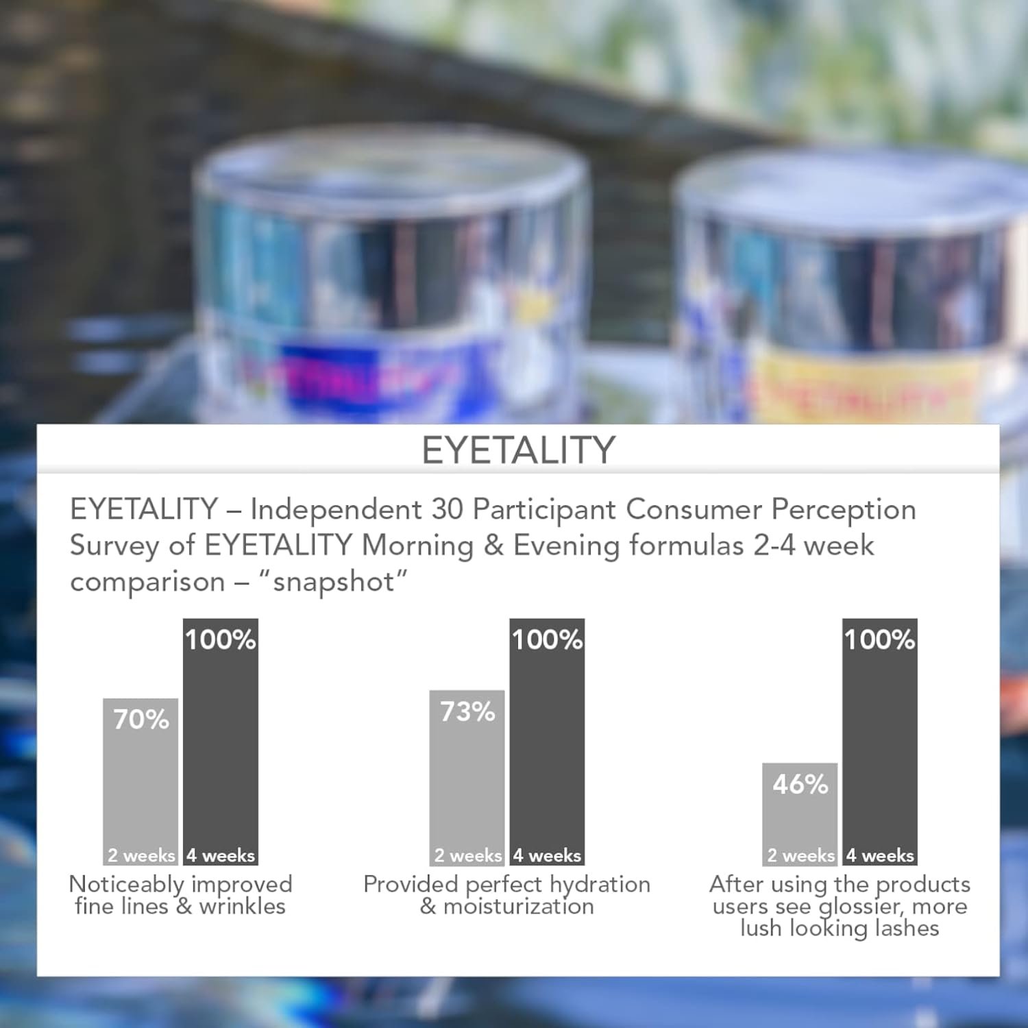 MORNING EYE CARE – Apply each morning to de-puff and brighten the entire eye area. Improves the visible appearance of fine lines, wrinkles, crow’s feet, dark circles, discoloration & puffiness.