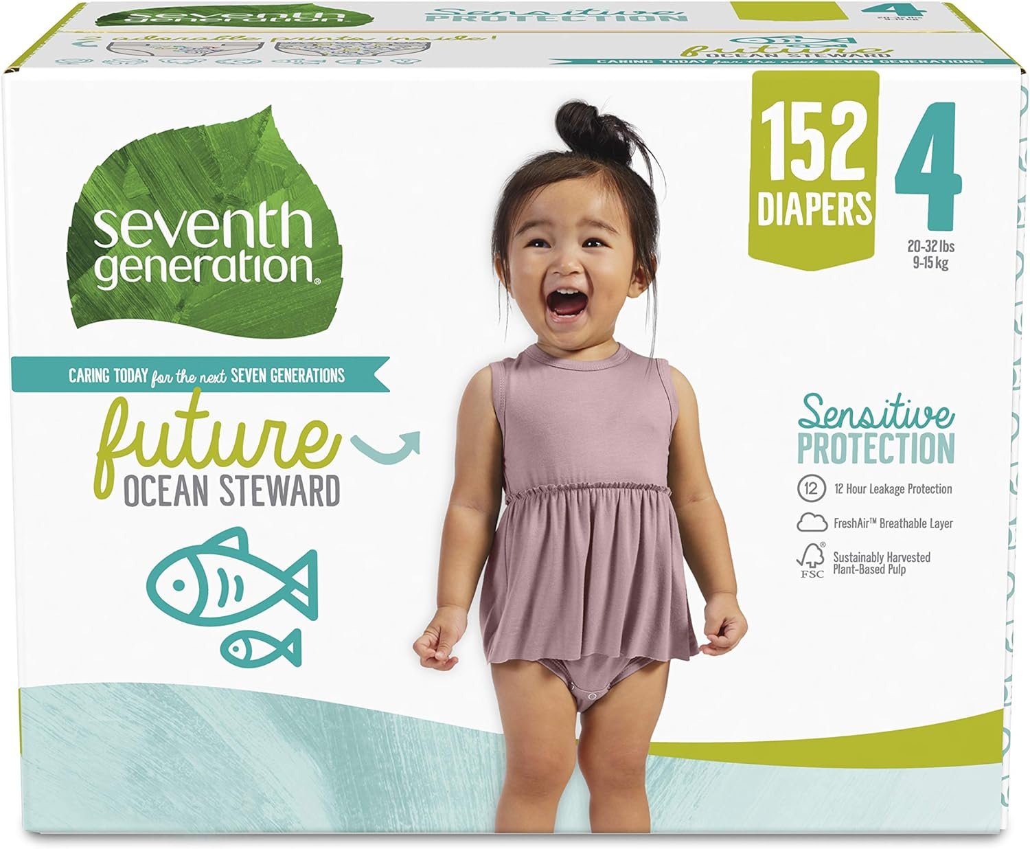 “Give your future Wildlife Protector a clean, fresh start with Seventh Generation size 4 Diapers. Sensitive protection for a happy today, made from materials that nurture a healthy tomorrow. Our absorbent core provides the long-lasting, 12-hour protection your busy baby needs, while our fresh air Breathable Layer helps release humidity. And that’s not all. Our Free and Clear Baby Diapers size 4 are gentle on your baby’s sensitive skin with 0% fragrances, lotions, or chlorine bleaching, and use only FSC Certified, sustainably sourced wood pulp that’s gentle on our planet’s forests, helping ensure your baby grows up on a healthy planet. Wrapped in Seventh Generation’s most absorbent, most sustainable diapers chlorine free —the future looks good on your baby. We believe in a Seventh Generation. We believe that children born today and seven generations from now deserve to live on a healthier, more equitable planet. Though they’re only in diapers now, today’s children are the future planet lovers, peace advocates, change makers, ocean stewards, humanitarians, global citizens, and wildlife protectors of tomorrow. Giving them a clean start makes it easy to feel hopeful for the future. That’s why our Sensitive Protection diapers use only FSC Certified, sustainably sourced wood fluff pulp, and no chlorine bleaching, to help protect this future. Our responsibility doesn’t end with sustainable sourcing. While today’s diapers are disposable, we’re on a mission to find a zero-waste solution. And beyond developing products, Seventh Generation advocates for real change on climate justice and other issues that are important for the health of future generations. Thank you for joining us in caring today for the next seven generations.”