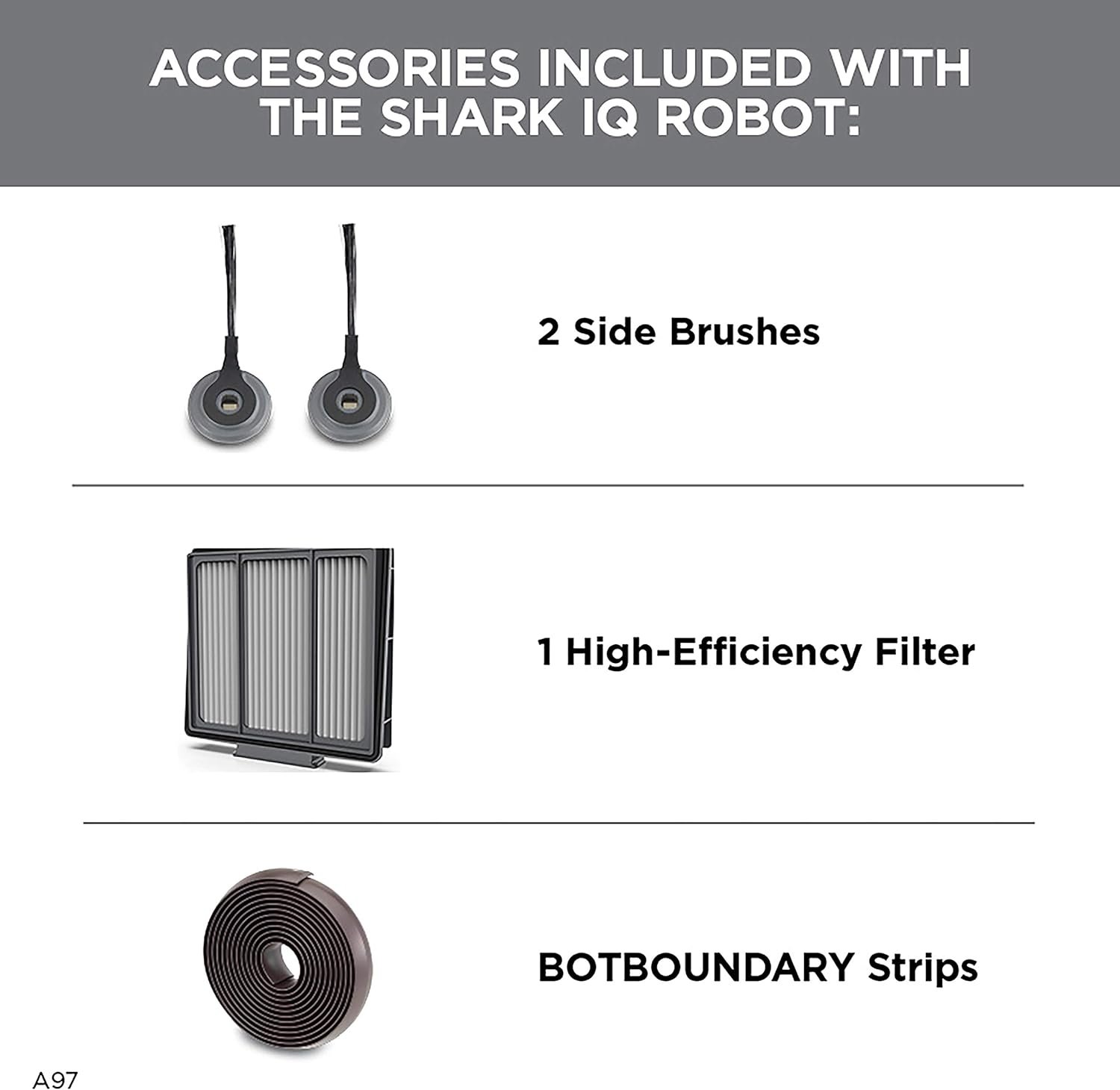 WHAT’S INCLUDED: (1) shark iq robot, (1) charging dock, (2) side brushes, (1) filter, (1) botboundary strips